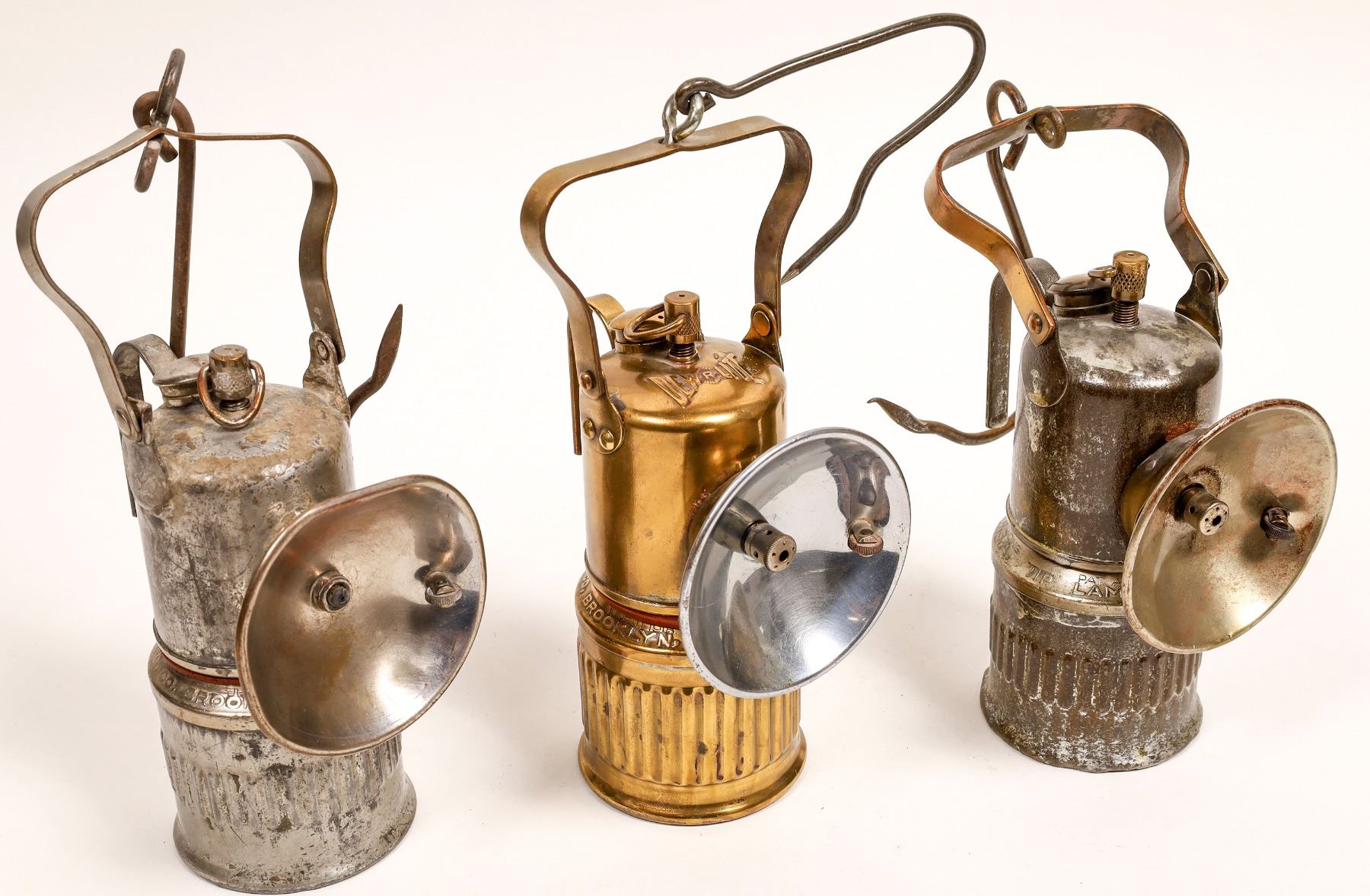 Three underground miner's lamps. Two nickel, one brass. All three read ITP LAMP DEWAR MFG CO. BROOKLYN, N.Y. U.S.A. at the top rim of the carbide canister. Each is about 9.5 inches tall, 3 inches in diameter, with 3.5-inch diameter reflectors. All three in well-used condition. The ITP meant It's Trouble Proof, which is just what you wanted in the underground. All pieces appear to be present. See photo for specific condition details.