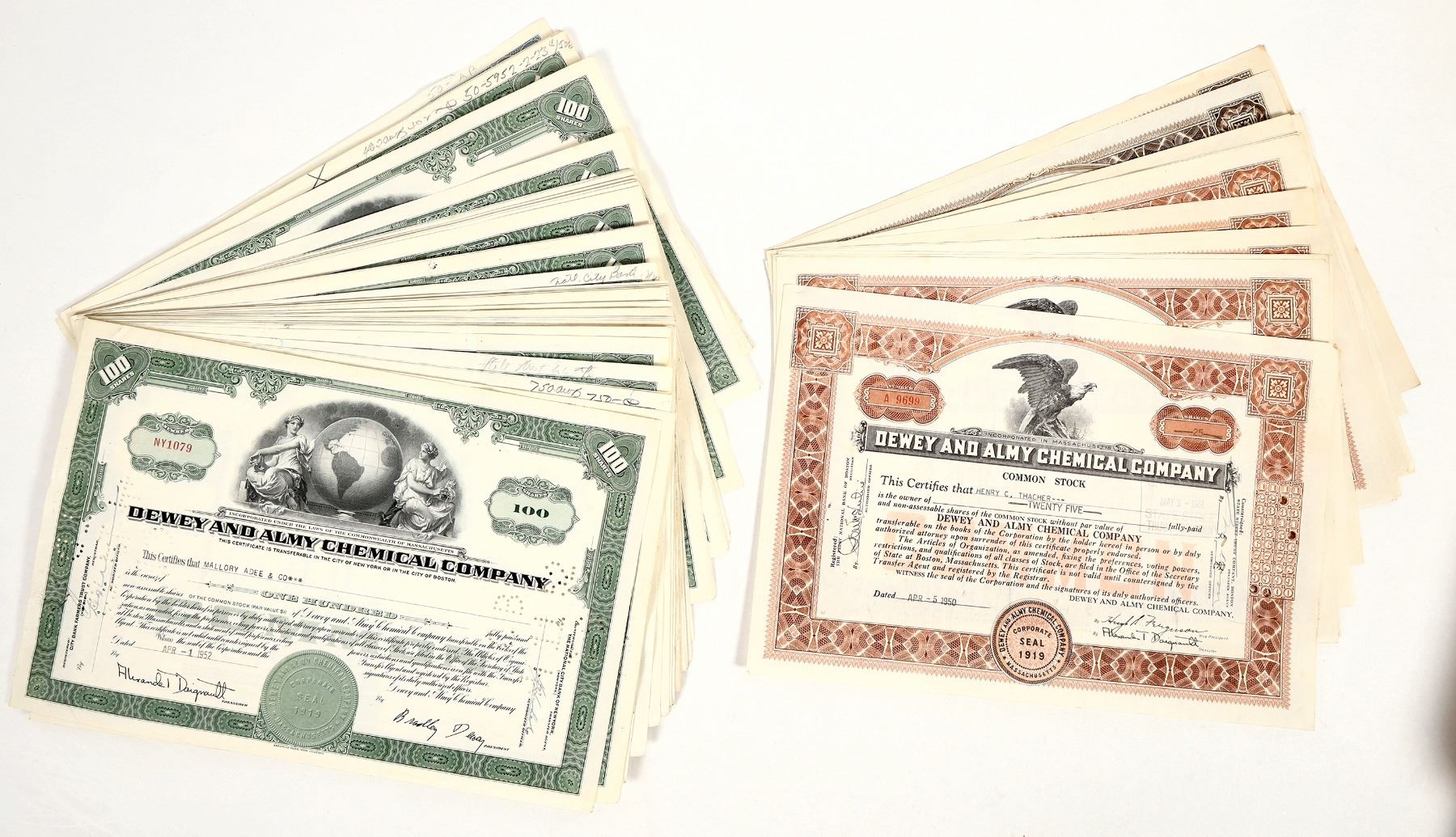 Group of approx. 80 stock certificates from the Dewey and Almy Chemical Company of Cambridge, Massachusetts, issued 1941 to 1953. Lot includes 3 varieties: blue, brown, and green. All issued and cancelled. 12"x8". All in good condition; see photos for detail.