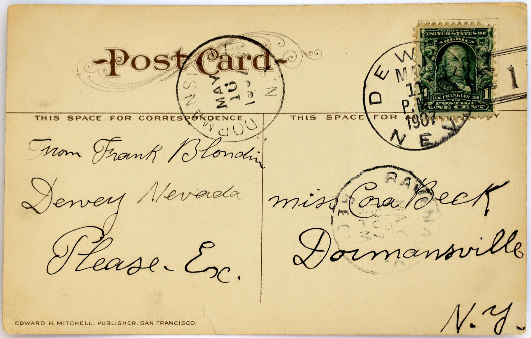 Dewey was a mining camp, thirty-one miles northeast of Reno near Pyramid Lake. The sender is Frank Blondin of Dewey. He was quite a character. After mining died at Dewey he stayed on and ran a one man mine and mill for decades. But he is best remembered as the man who single handedly capture hooligans shooting wild horses. He did complain to the sheriff at Reno, but the sheriff wasn’t going to send an officer 31 miles ‘in case’ these hooligans show up. So Dewey waited patiently, got the jump on them and marched them the 31 miles to Reno. The newspaper remarked that they arrived just as the jail was opening for business. Blondin bio included! 1907. Very strong strike over stamp. Reverse shows Commercial Row in Reno.