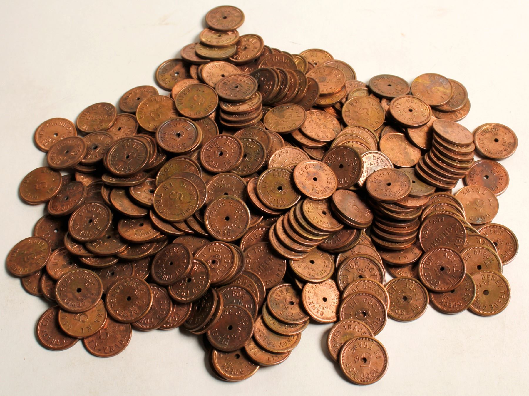 A 3 pound hoard of copper Nevada tokens, hundreds of tokens! tok DEWEY TRADE / CHECK / ELY, NV //GF 5C / IN TRADE, multiple varieties, some with center holes.