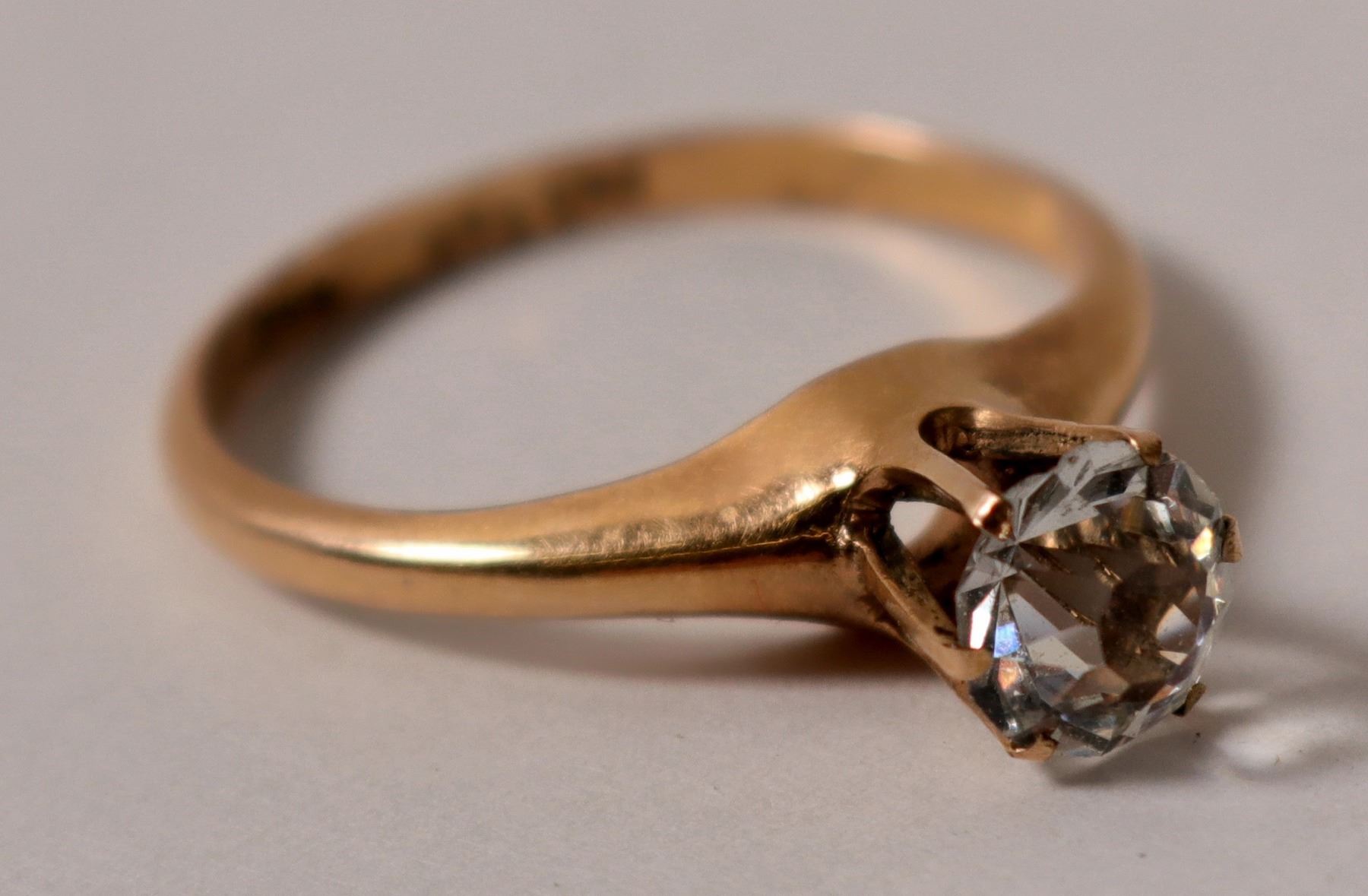 Approx. size 7.75. This solitaire diamond is 6.18 mm outside measurement, depth is 4.5mm, European cut. Set in 14 carat gold. Total weight is 2 grams. Outstanding quality. Color is white. Note: there are 3 chips on girdle of diamond. City: State: Date: c1900