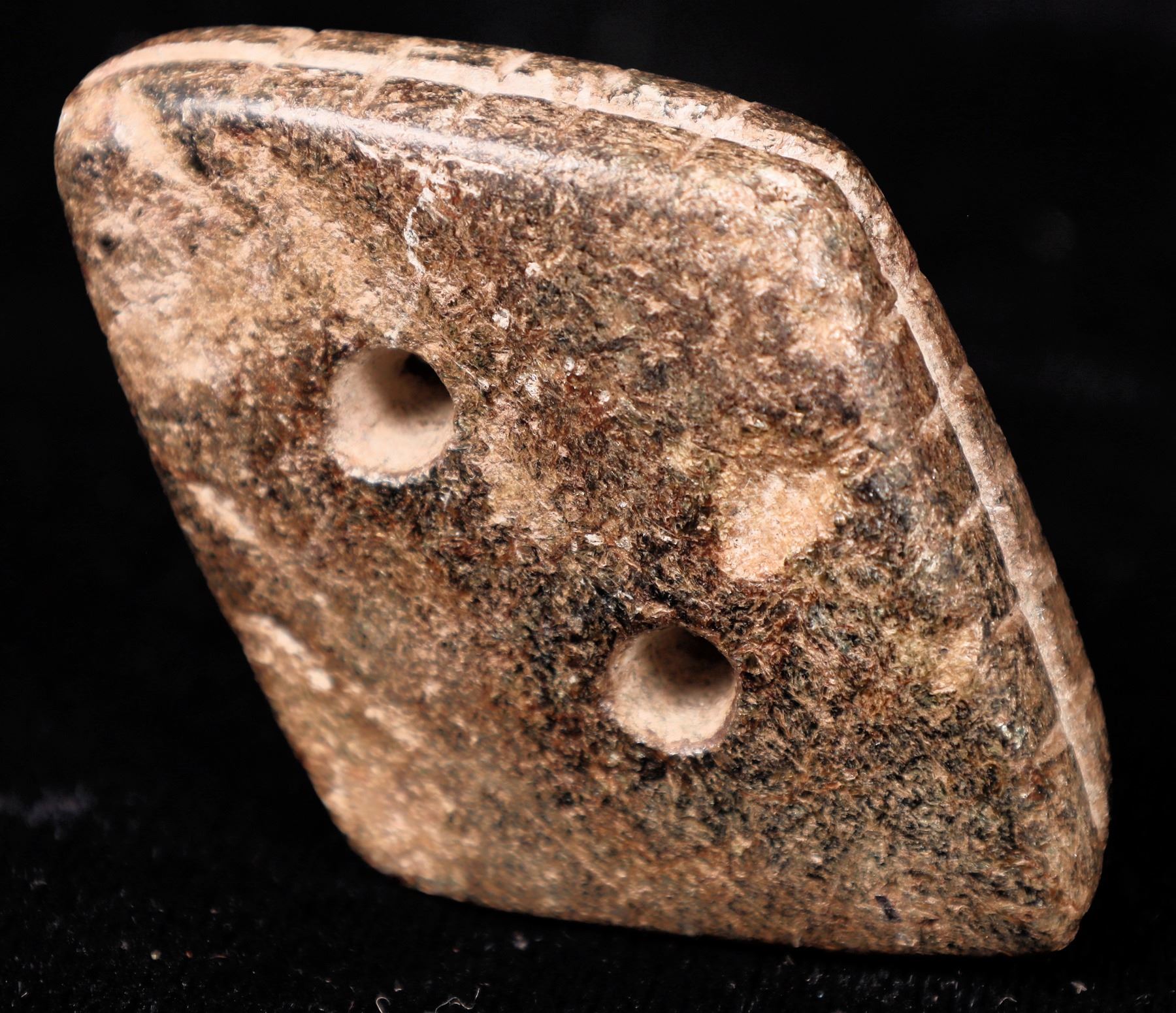 This diamond shaped stone is 2.75 in./ 70 mm X 1.675 in./ 41 mm in width. The stone is uncataloged from the Bracken collection but likely from Kay County, Oklahoma, in the Arkansas River basin (speculation). This stone has similar characteristics of a stone gorget with two holes 13/16 in. apart (ref. Oklahoma Indian Artifacts, Bell, 1980, pp. 52,53). Robert Bell considers these artifacts "a rare find in Oklahoma and more prevalently found in the Great Lakes states and associated with the Archaic and Woodland periods. Oklahoma appears to lie on the western periphery for the distribution of these artifacts", p.53). This stone has four sides similar to a Harahey knife; no matter how you hold it -it works. The stone has been polished but not to perfection with divots and pockets; it's not beautiful to look at. The edges, all four, have been scribed with a line or groove (similar to a boatstone) and with graduated hash marks at roughly .250 in. on all four sides (measured with a machinist's scale). This researcher believes that this may have been more than a gorget but a tool kept around the neck and not to be lost (conjecture). Similar artifacts with two holes often show signs of wear at those holes implicating a function rather than personal decoration. (ref. Prehistoric Implements, Moorehead, 1983, p.222). Little is known of archaic period fishing with lines being used at 2000 B.P. It is speculated that this tool was possibly used for making cordage from two lines twisted (through the two holes) and later knotted at the intervals of the graduated hash marks while laid into the groove to make a fishing net. This theory would be supported by the round cornered gorget stones found in this auction and the plummet stones as net weights, sold in an earlier auction of Bracken artifacts. (ref. Indian Artifacts, Russell, 1974,pp. 66, 68, 69). Please see photos for details. (KAW)