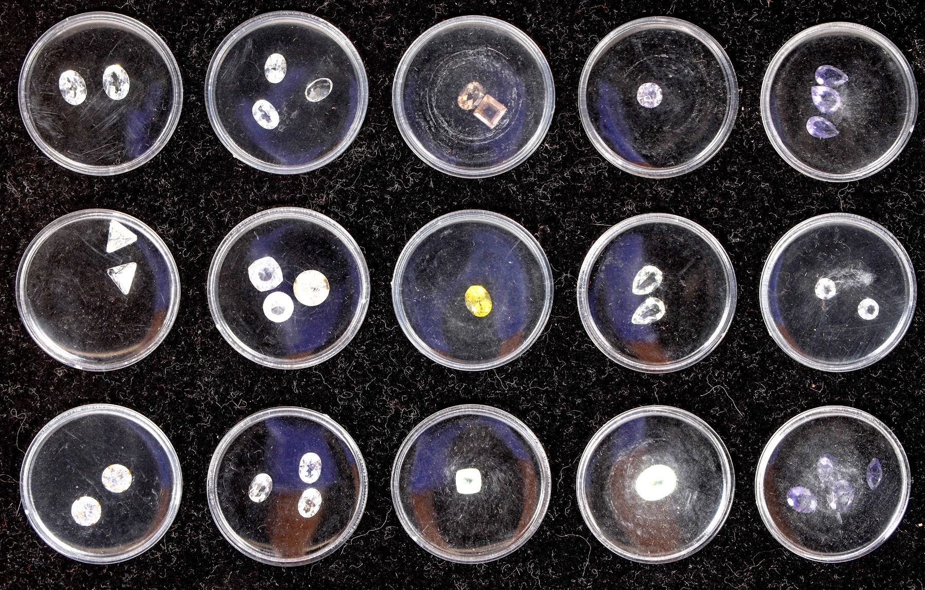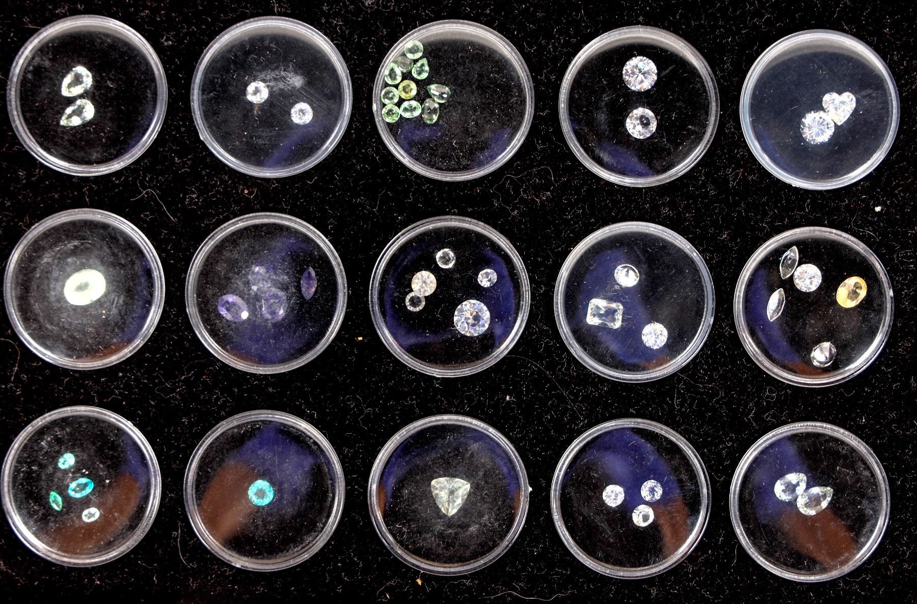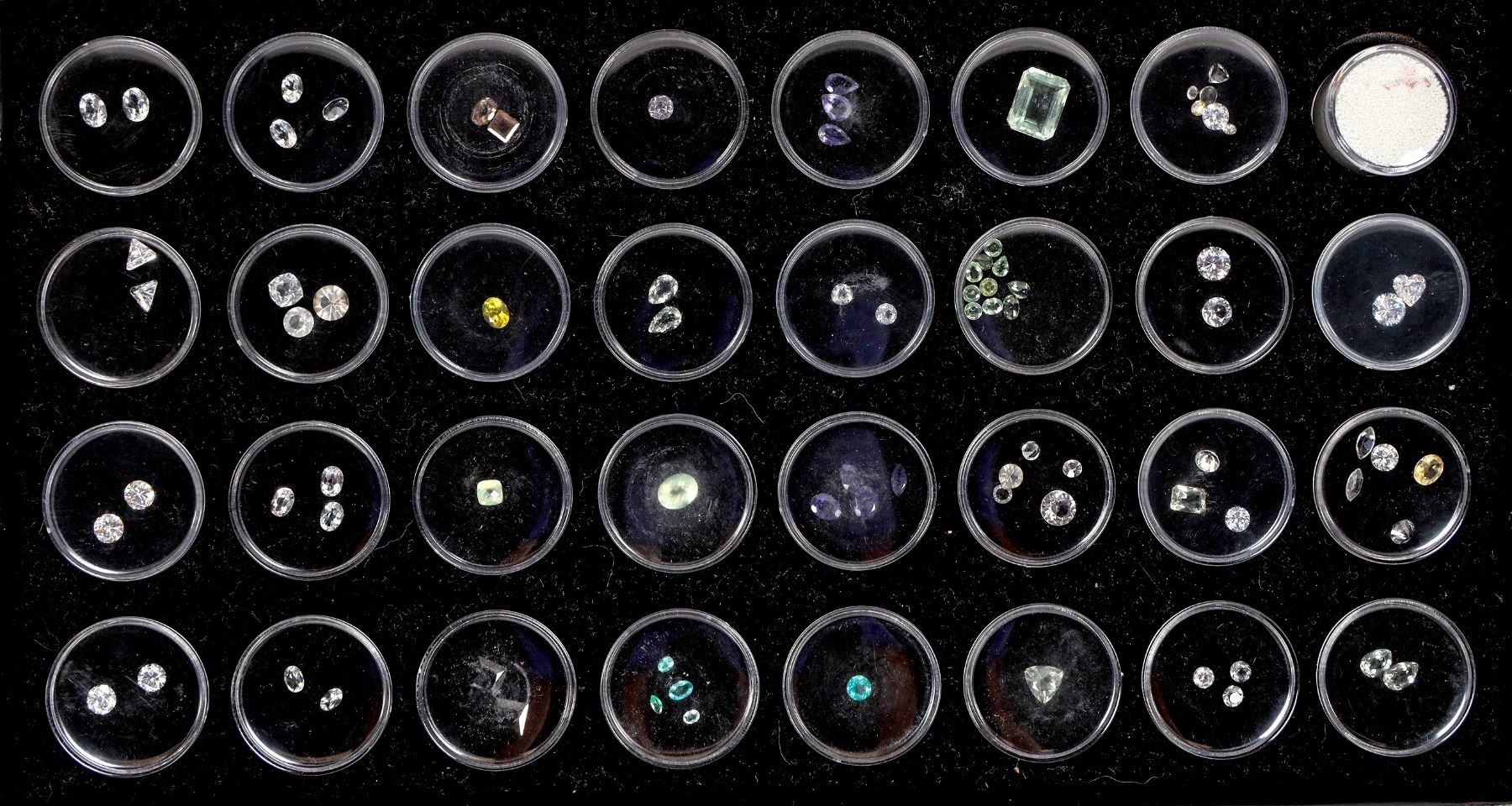 Fine Collection of 10 different faceted gemstones in 1" circular gem holders. 32 containers overall. Over 100 or more stones overall. Includes artificial diamonds, cubic zirconia, Iolite, and a few very small pink diamonds. Please inspect, an excellent lot. About 1mm up to 8mm. Numerous different faceted shapes and hues.