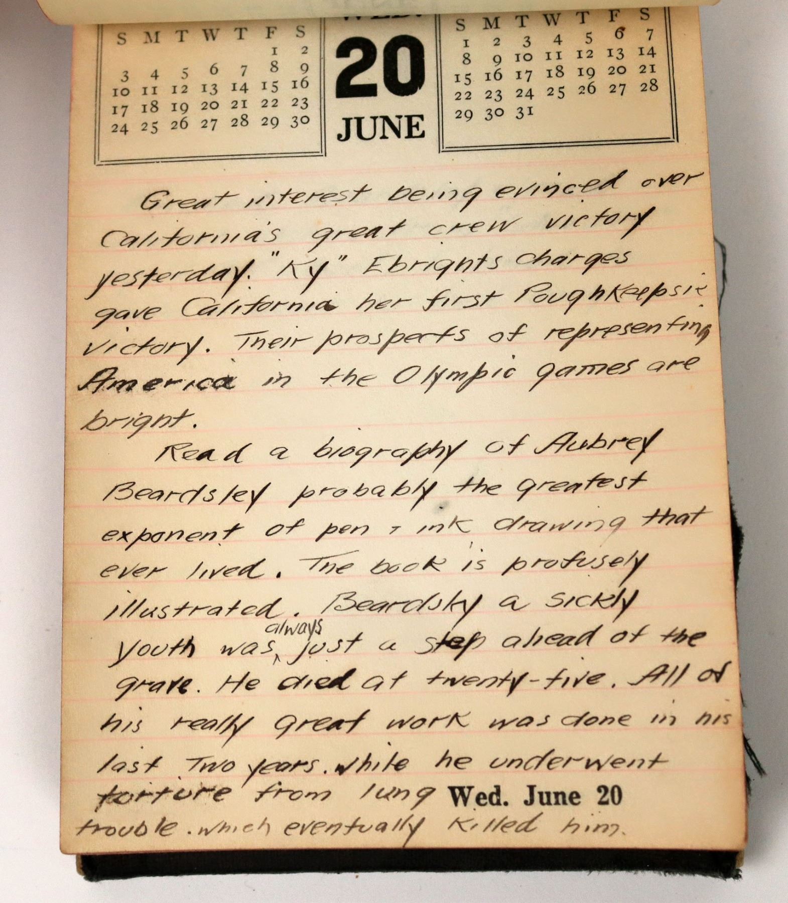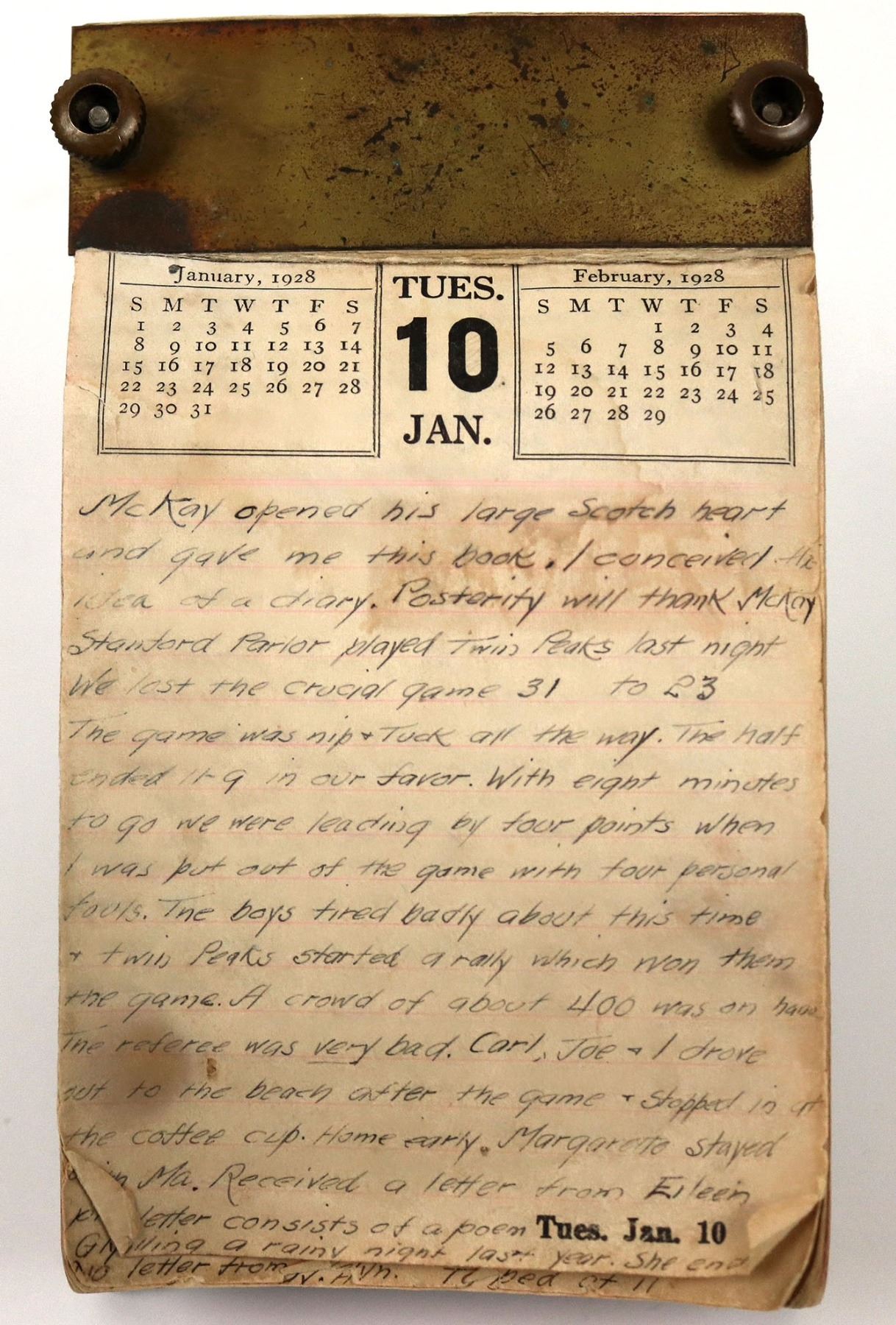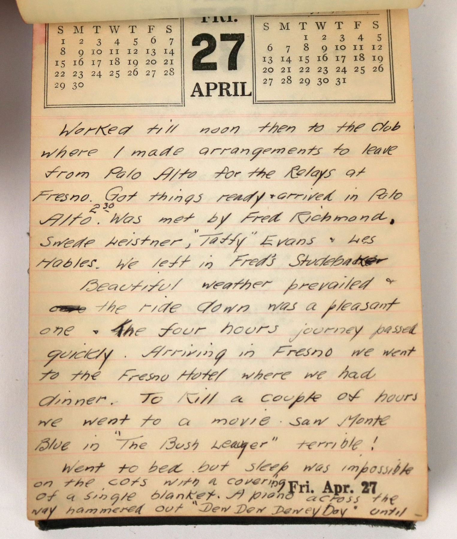 January 10 to November 11, 1928 diary on a desktop calendar. Playing in and losing an unspecific sporting game, notes on track and field competition, November 8 entry related to Hoover winning the presidential election etc. Mention of Santa Cruz, Livermore. Back of August 2 page reads, "This was by far America's darkest day' and is likely related to a poor showing in track and field in the 1928 Summer Olympics in Amsterdam.