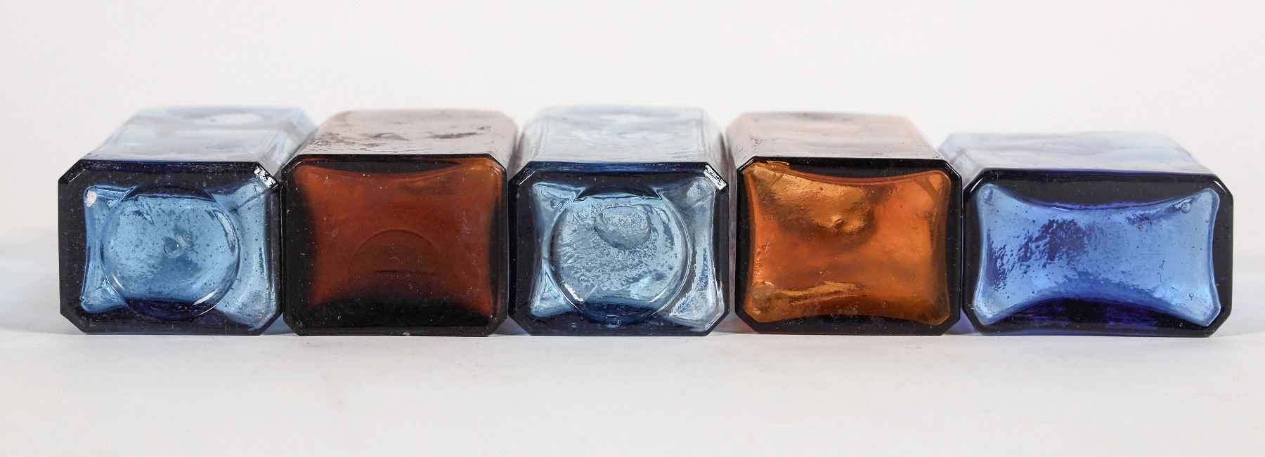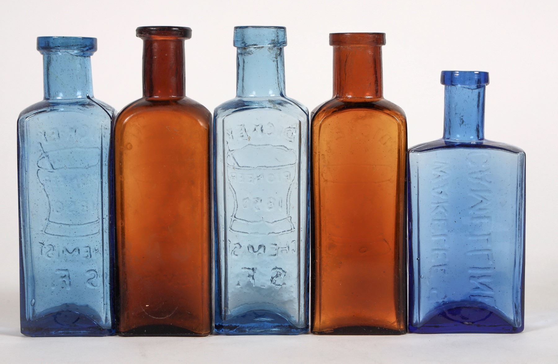 Lot of 5. 1) Four different Dickey Chemist 5.75" bottles. Rarest is the amber one with the pestle on the left. The other s have right pestles. A total of 2 amber and 2 cobalt. 2) Also, cobalt Wakelee's Camelline. No apparent chips or cracks.