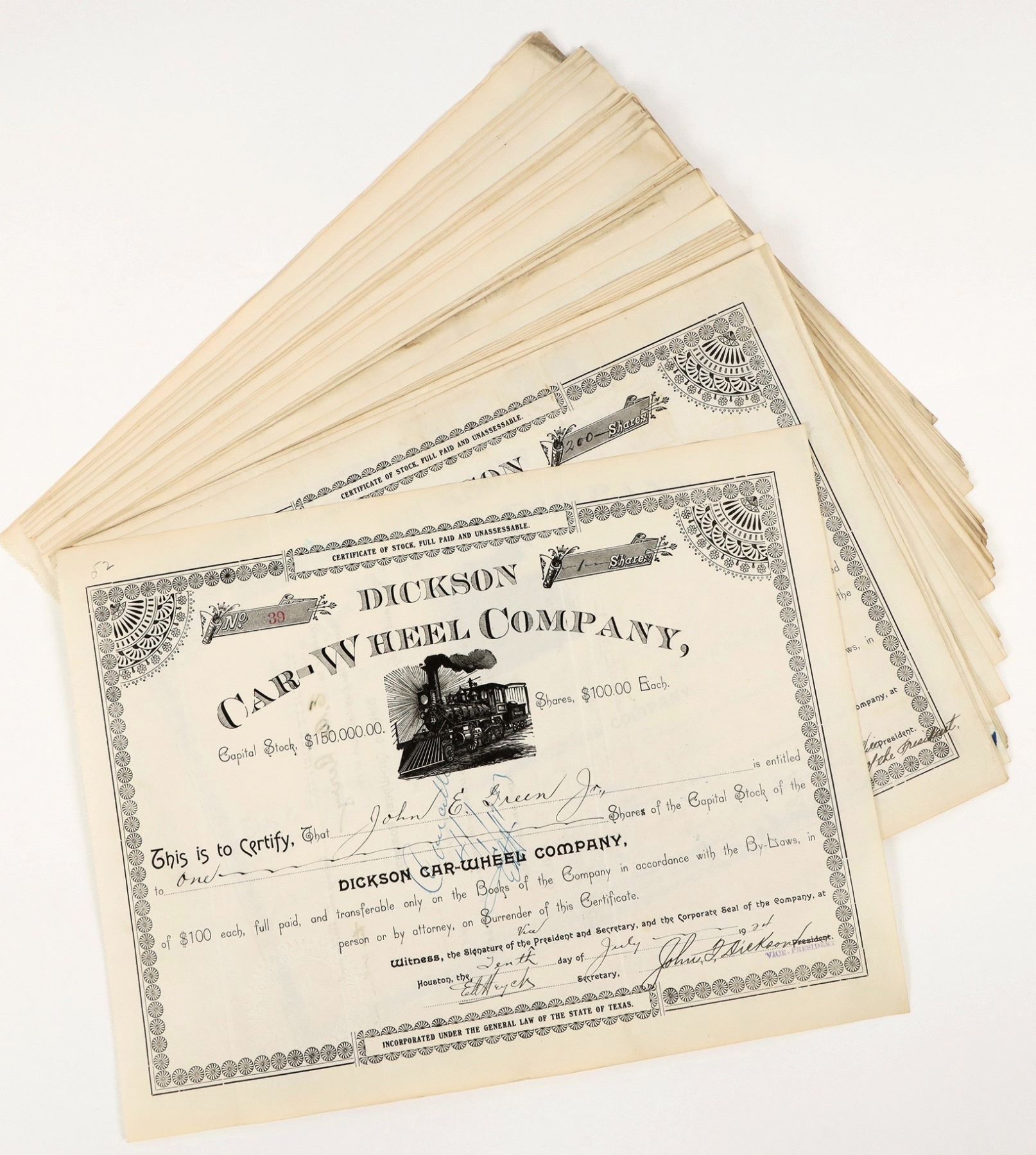 Group of 40 stock certificates from the Dickson Car-Wheel Company, issued 1920 to 1924. 17 certificates are issued and cancelled with handwritten cancellations, all others are unissued. Striking vignette of locomotive. 11.75"x9" certs, varying in condition with very light foxing on some pieces; see photos.