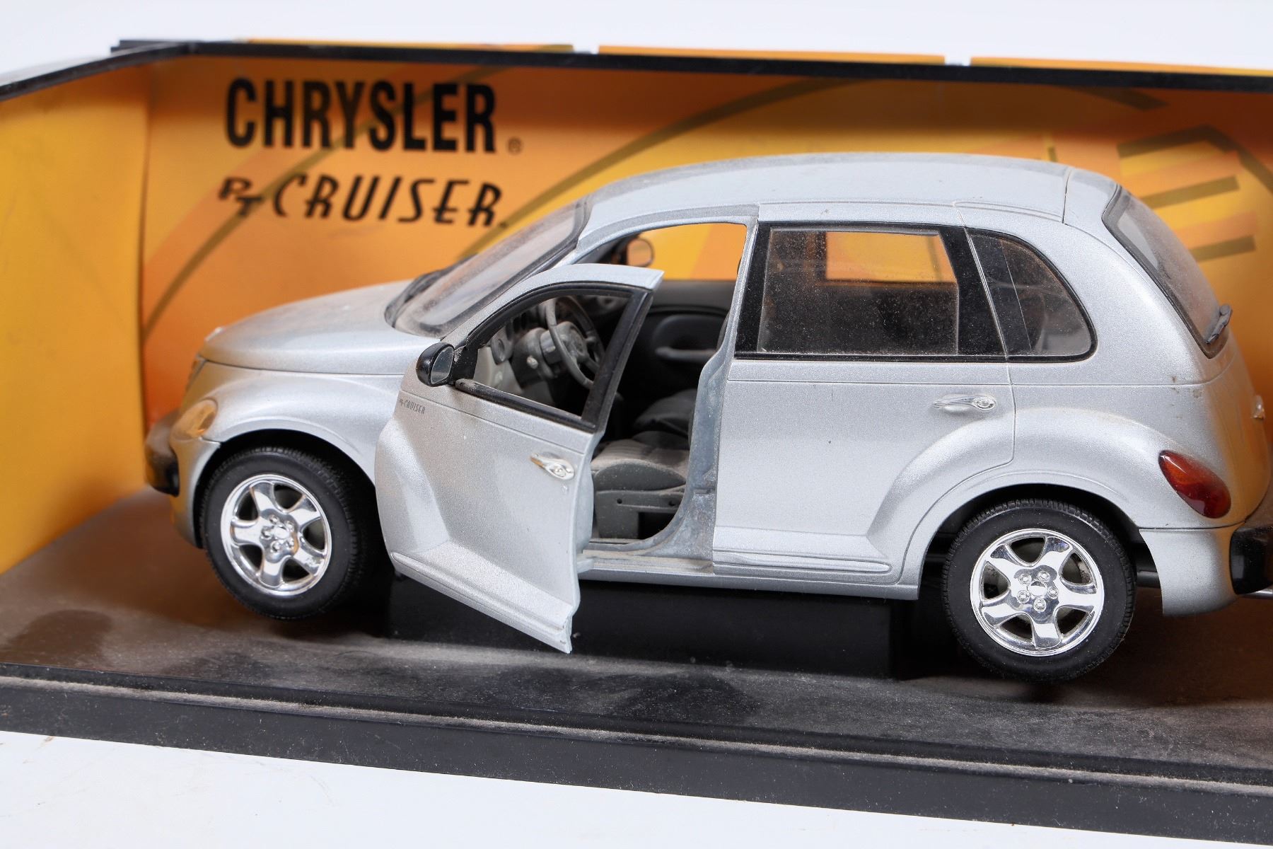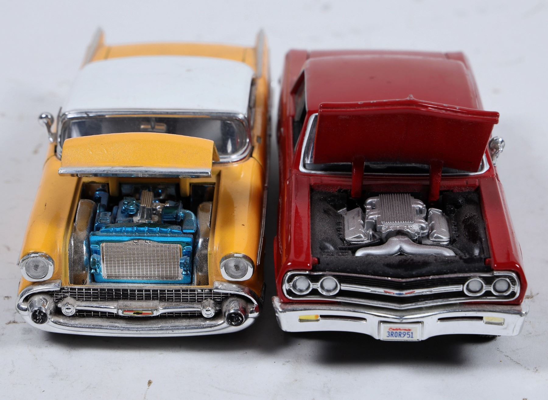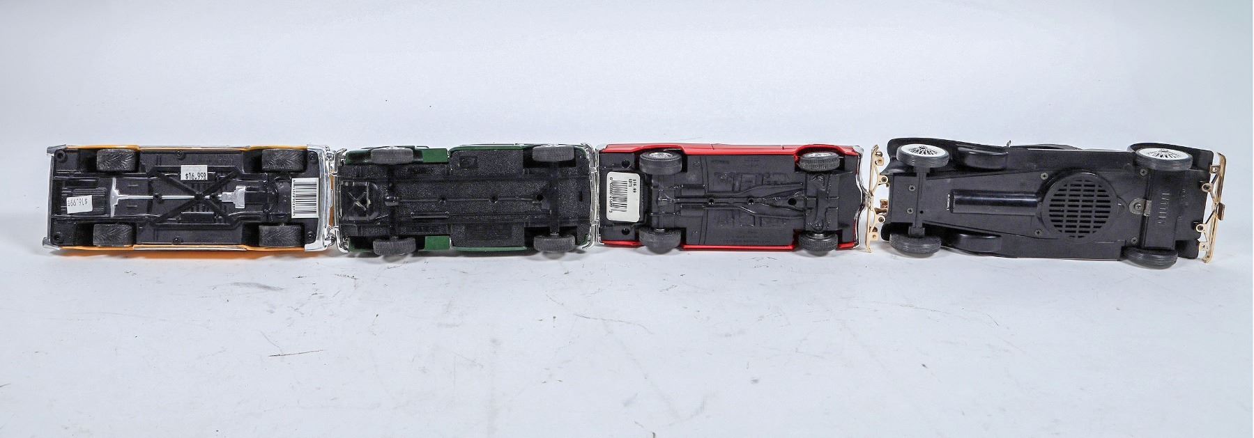 1. 1931 Rolls Royce Phantom II by WG w/am radio, in excellent working condition. 2. 1955 Chevy step side. 1/24, green, no tailgate otherwise in exc. cond., doors open. 3. '65 Malibu SS, 1/24 by Maisto, doors/hood open, near new cond. 4. "57 Chevy Bel Air low rider, 1/24. yellow/white, doors/hood open, steering wheel broke/included. 6.2001 P/T Cruiser, Display case, doors open, steering wheel turns wheels, unk manuf. Like new. Each approx. 8” P/t Cruiser 10” L