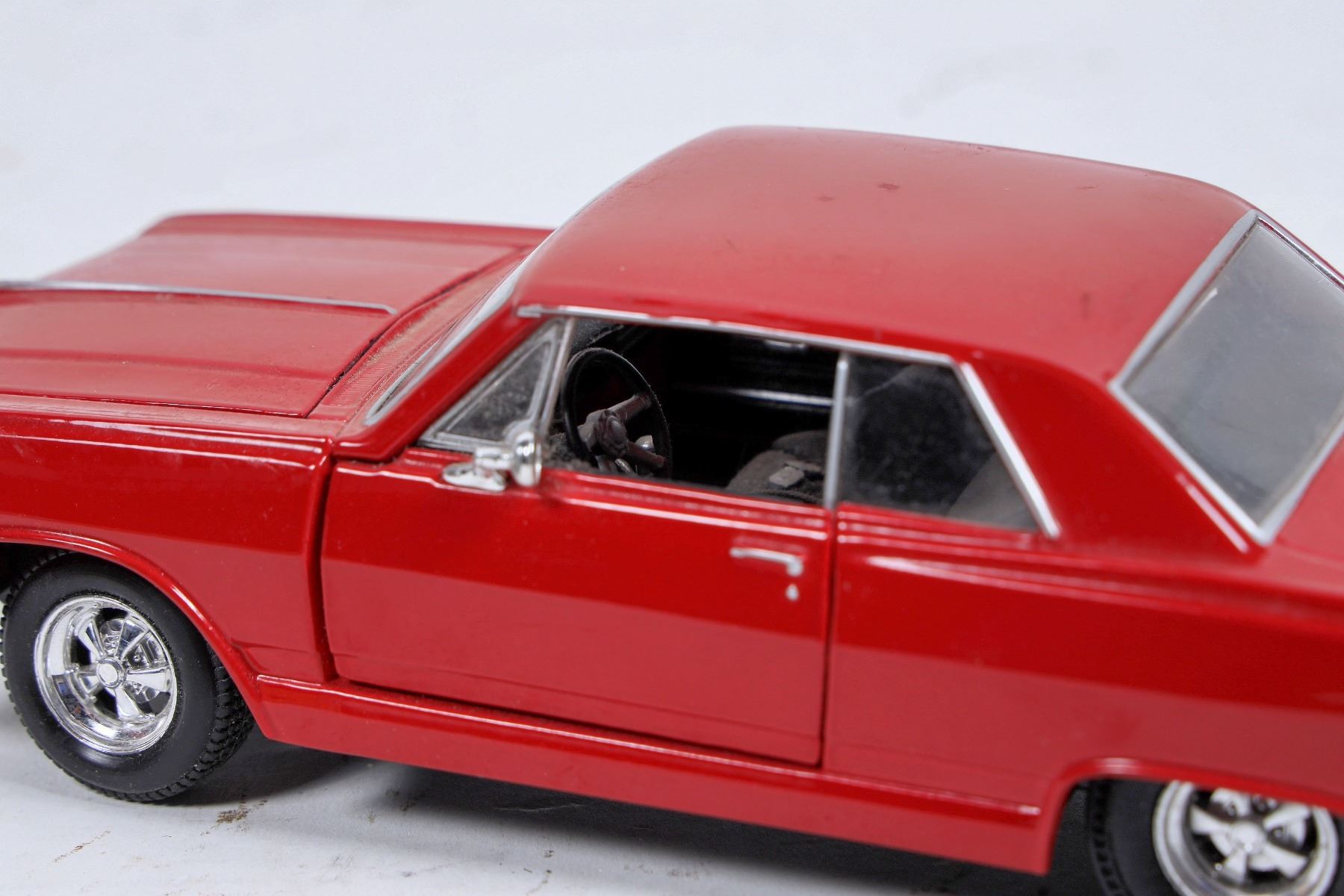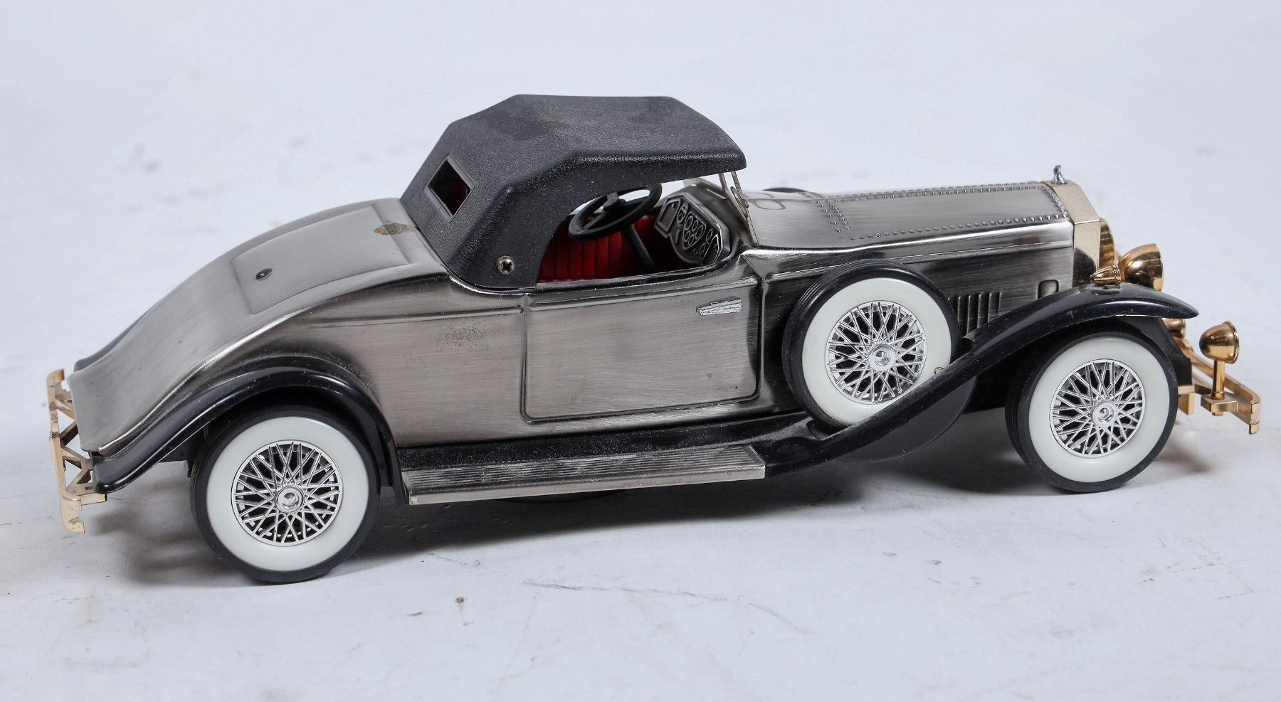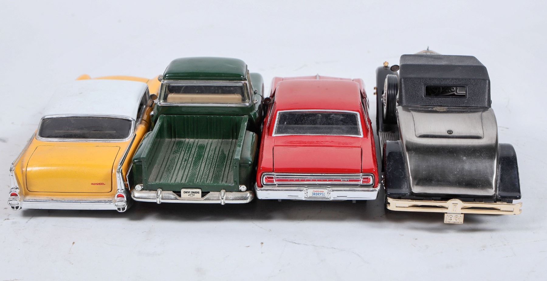 1. 1931 Rolls Royce Phantom II by WG w/am radio, in excellent working condition. 2. 1955 Chevy step side. 1/24, green, no tailgate otherwise in exc. cond., doors open. 3. '65 Malibu SS, 1/24 by Maisto, doors/hood open, near new cond. 4. "57 Chevy Bel Air low rider, 1/24. yellow/white, doors/hood open, steering wheel broke/included. 6.2001 P/T Cruiser, Display case, doors open, steering wheel turns wheels, unk manuf. Like new. Each approx. 8” P/t Cruiser 10” L