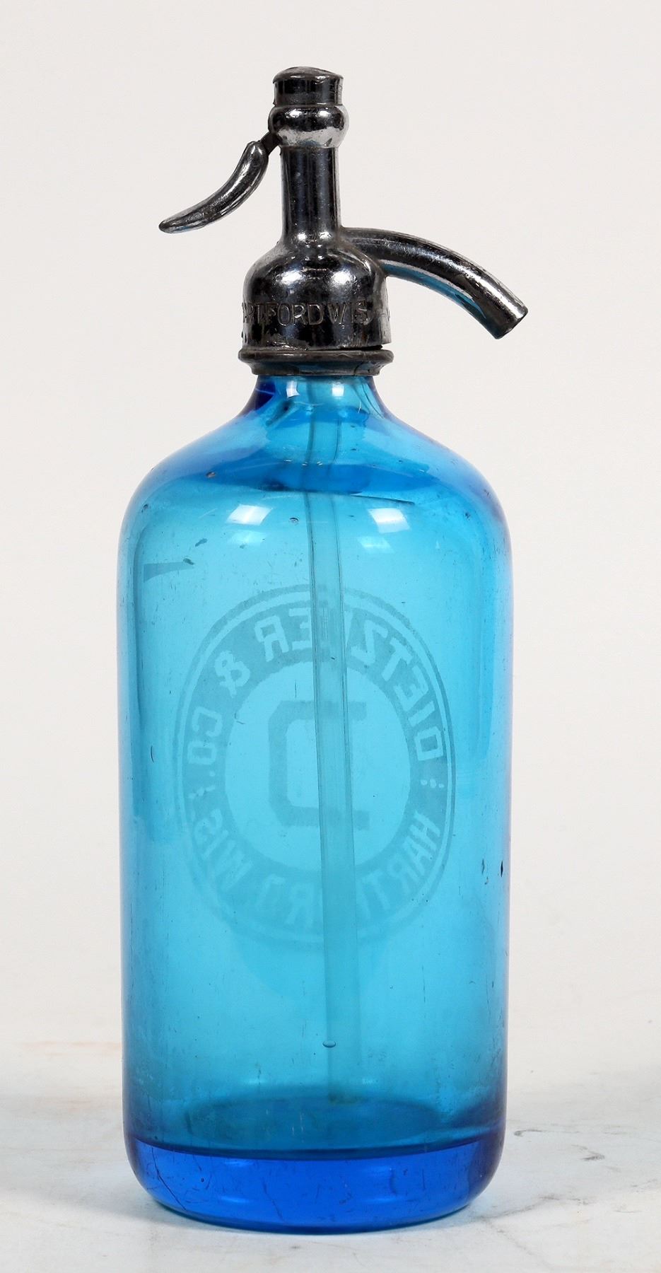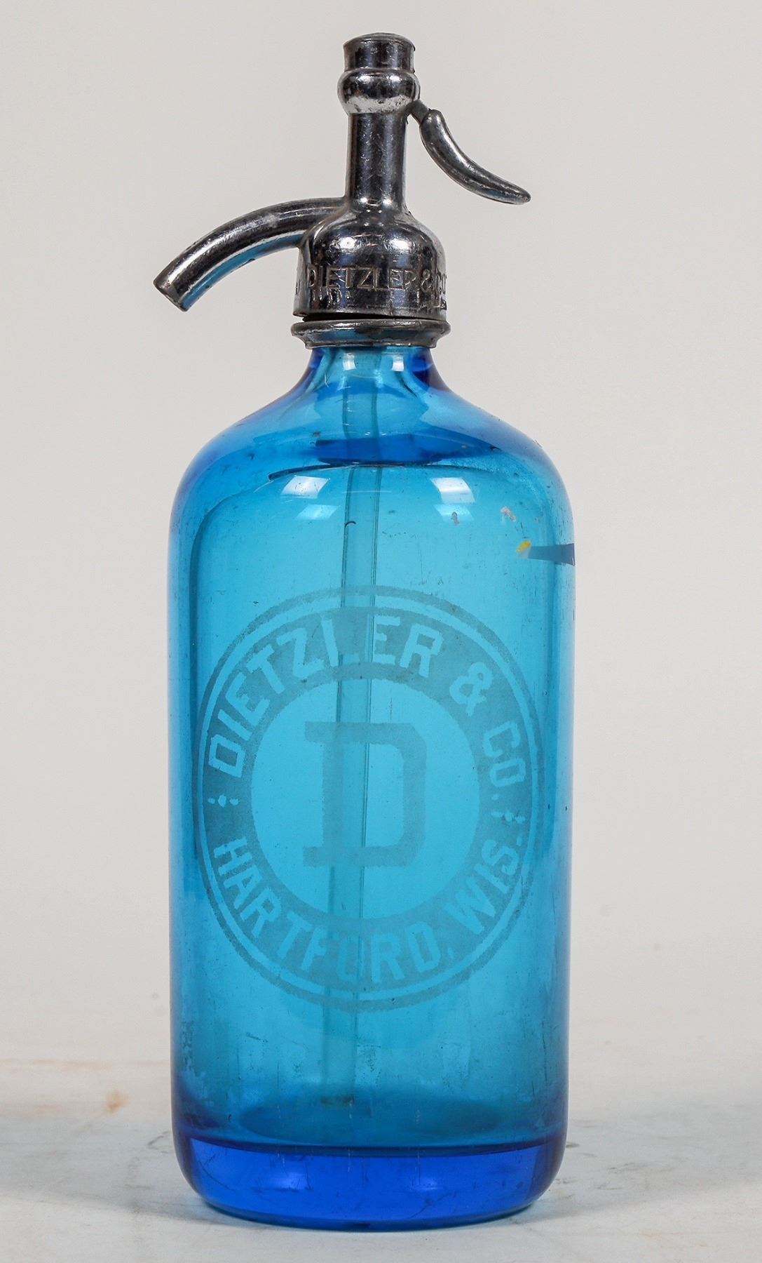 Blue cobalt seltzer bottle from Dietzler & Company of Hartford, Wisconsin. No chips or bubbles in excellent condition. Please see photos for more details.