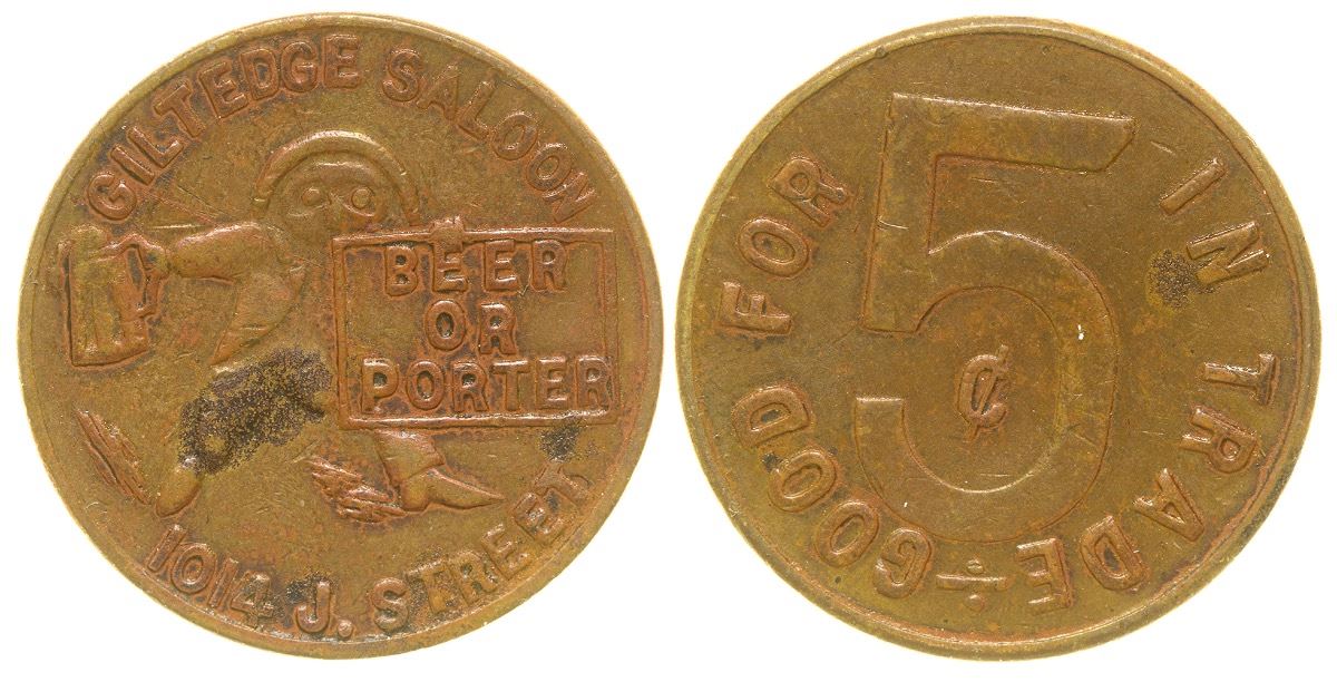 Gilt Edge was a San Francisco Whiskey brand that has 8 embossed trademarked bottles with various dates that range from 1882-1905. See Barnett pg. 162. Gilt Edge Saloon / Beer or Porter/ 1014 J. Street // GF / 5c / IT. Round, Brass, 21mm. Penguin or creature vignette on front. City: San Francisco State: California Inventory Number: 38941