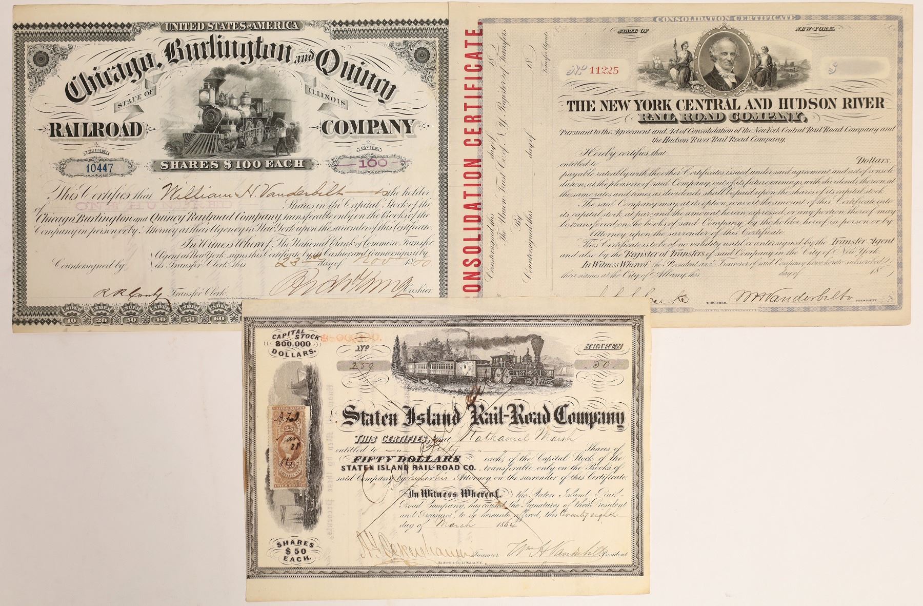 1) The first one is a Chicago Burlington and Quincy railroad company. Cert. number 10447 for 100 shares. Issued to William H Vanderbilt on November 23, 1880. Cashier signature illegible. Also signed by WH Vanderbilt on the reverse. No hole cancels on signature. 2) The second certificate is the New York Central and Hudson River Railroad company. Certificate 11225, not issued but signed by WH Vanderbilt as president. 3)The last one is Staten Island Railroad company. Issued to Nathaniel Marsh. Certificate 259 for 50 shares on March 28, 1864. Signed by WH Vanderbilt as president; not signed on diverse. A nice trio of Vanderbilt signatures from the Vanderbilt railroad empire. WH Vanderbilt was the eldest son of "Commodore" Cornelius Vanderbilt. Even though he outlived his father by only eight years, he increased the profitability of his father's holdings, increased the reach of the New York Central Railroad, and doubled the Vanderbilt wealth.