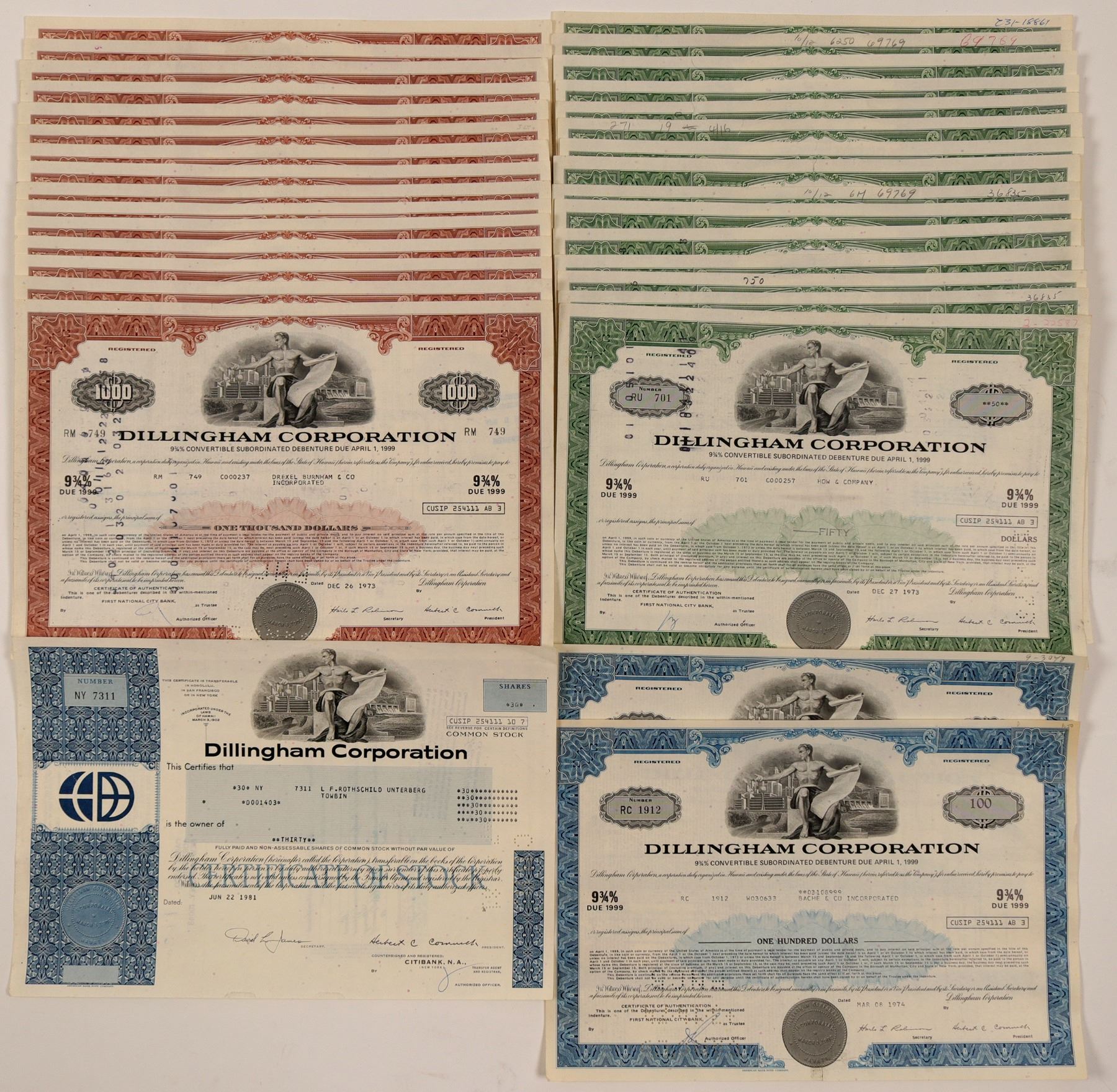 Lot of 33. Three varieties, issued 1973-1981. Green, brown, or blue borders with allegorical vignette. Printed by ABN. This company was a consolidation of the Oahu Railway & Land Company and the Hawaiian Dredging and Construction Company in 1961. Benjamin Dillingham was a 19th-century Hawaiian businessman. This company was mainly involved in construction. It was sold in 1983. Ken Prag Collection