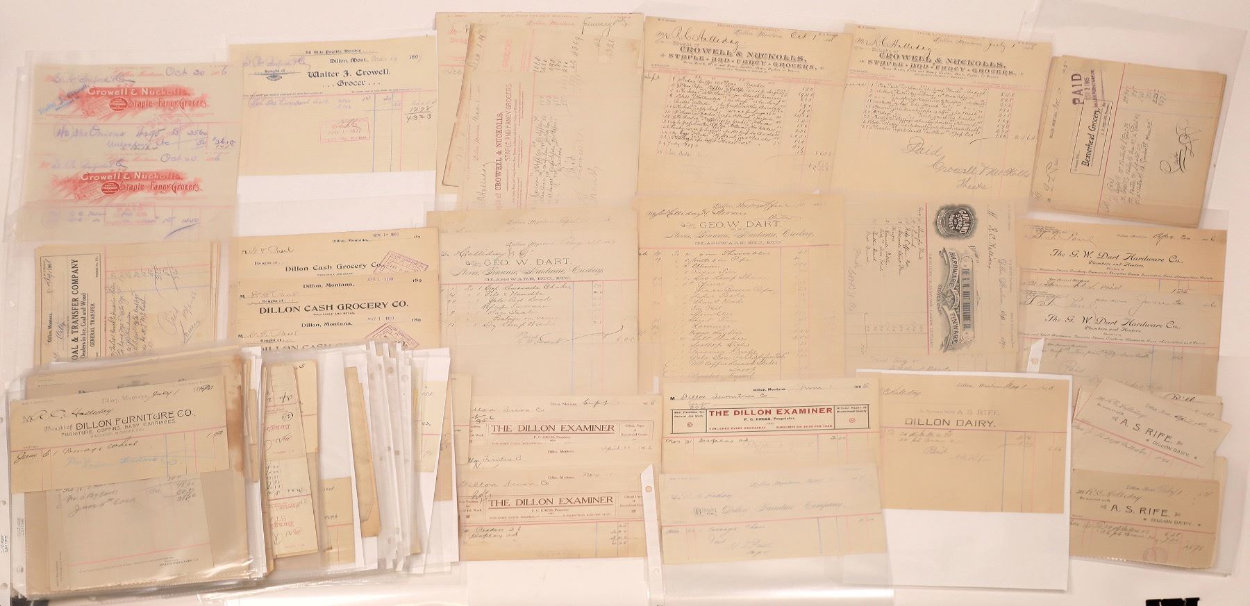 Collection of approximately 80 billheads and letterheads from Dillon, Montana. Businesses represented include M. Bradbury The City Express and Transfer, Edmund J. Calloway, Attorney at Law, Clark Anderson Meat Market and many more. Please see photos for more detail and condition.