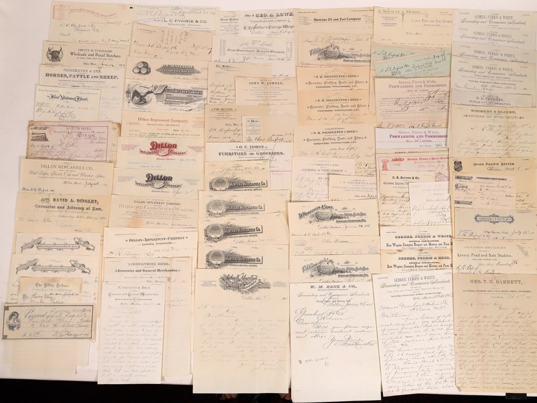 About 35 Dillon, MT letterheads and billheads, some pictorial, c. 1880-1900. Poindexter & Orr, Deputy & Staudaher Butchers, Dillon Tribune, RC Halliday Liquors, Dillon Implement, Dillon Fair and Racing Association etc.