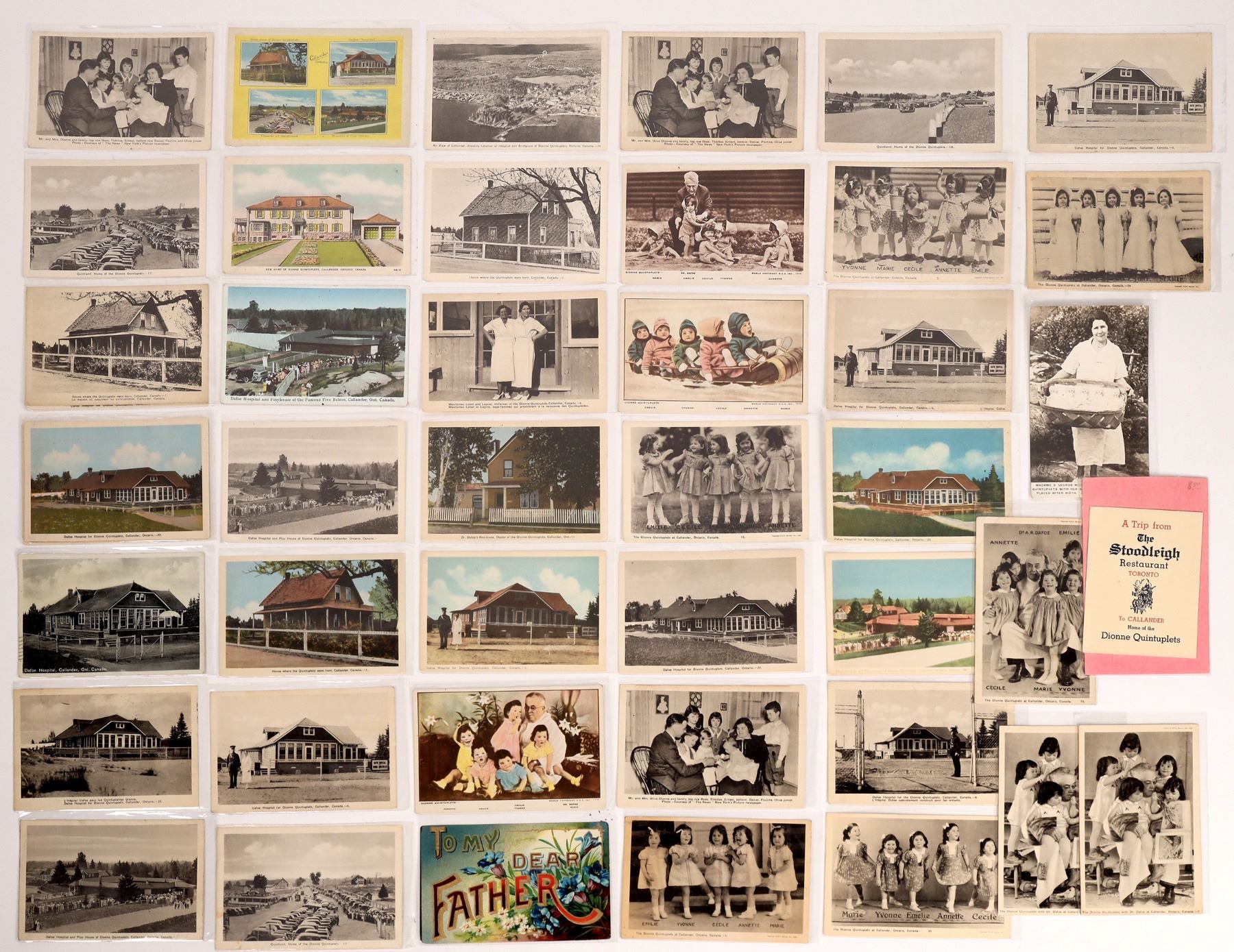 Lot of 27. One RPC. One tri-fold ad card for The Stoodleigh restaurant Toronto. Unfolds to display a map from Toronto to Callander quintuplets home. Seven postmarked:, Callander Ont, North Bay Ont., Boston, Sault Ste. Marie Ont. 1930's-40's