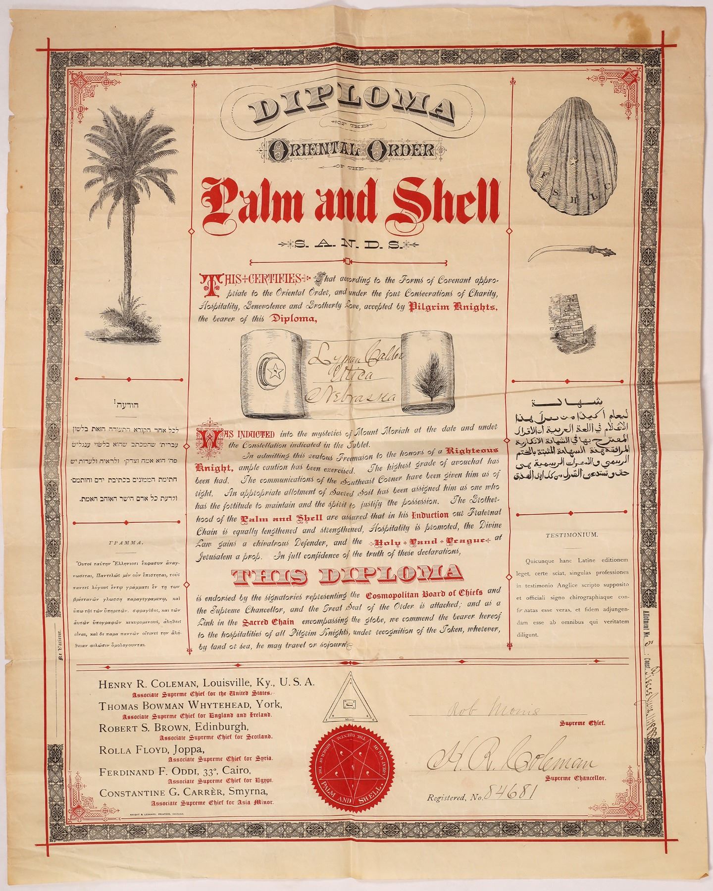 Diploma of the Oriental Order of the Palm and Shell given to Lyman Calder of Utica, Nebraska. Dated June 11, 1888. This diploma is written in Hebrew, English, and Arabic text. The Oriental Order of the Palm and Shell was a fraternal organization related to the Pilgrim Knights and the Freemasons. This diploma is printed in red and black with several vignettes and symbols all around. Good condition. Approx. 23.5 x 19 inches.