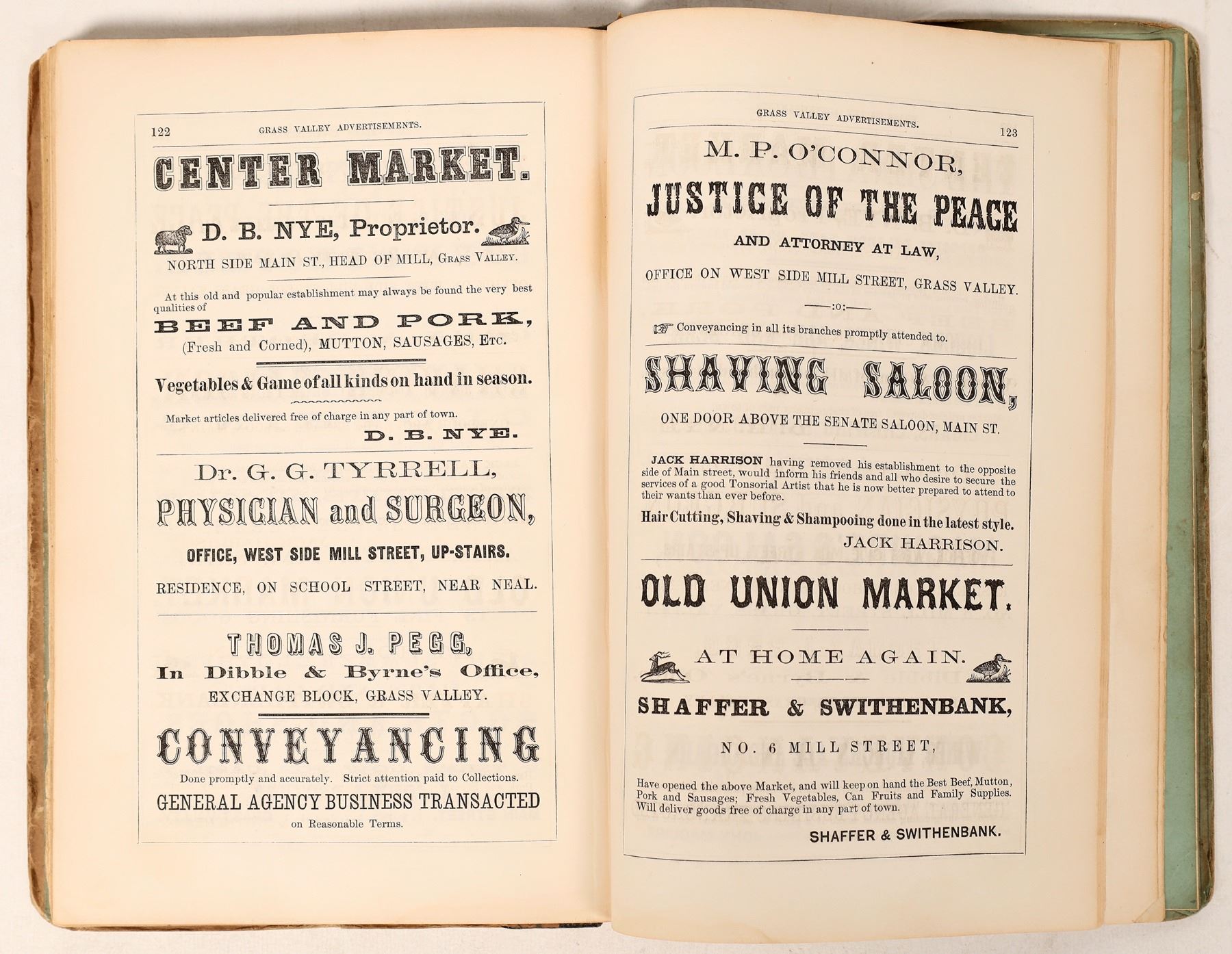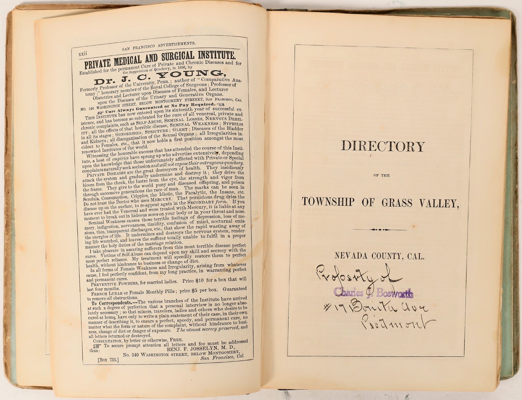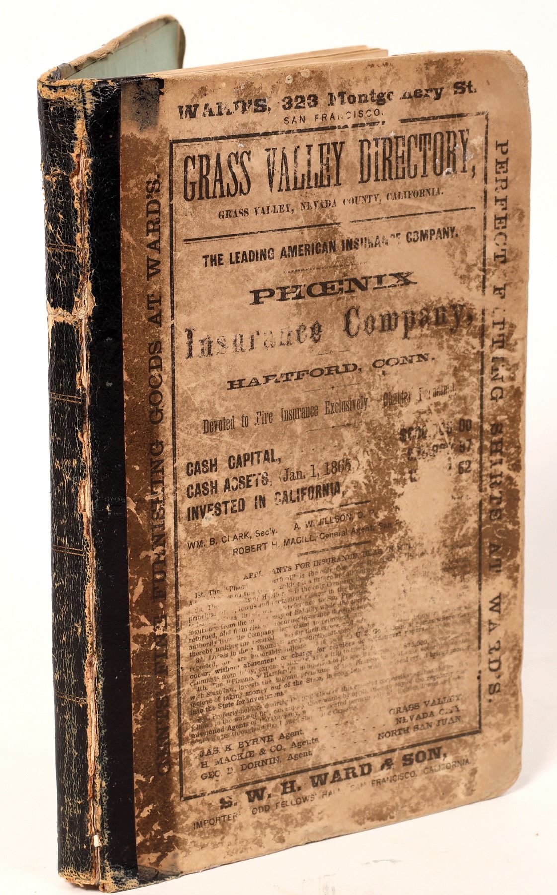 Directory of Grass Valley Township for 1865: Containing a Historical Sketch of Grass Valley, of Allison Ranch, Forest Springs; also a Description of the Principal Mines, all the Quartz Mills, Religious and other Organizations, etc. forming the most complete Mining Work ever published in Nevada County San Francisco: Charles F. Robbins and Company No. 416 Battery Street, corner of Merchant, 1865. xxix, {1 blank} Compiled and published by William S. Byrne, Green printed boards, with advertisements on inner and outer covers, black roan backstrap; 144 pp. First separate directory of Grass Valley and first major mining work on the area. Lacking first page of adds; copy laid in. Many advertisements. Pp. 69-88 are devoted to the Mines of grass Valley; pp. 89-92 to the Mines of Allison Ranch; pp. 100-101 cover the Mines of Forest Springs and Lone Jack. Pp. 106-112 detail the Quartz Mills of Grass valley. Pp. 113-143 contain full page advertisements (many illustrated). Also contains Quartz mining laws for Nevada County, adopted December 20.1852. Original cover worn but intact. Foxing, binding solid with some cracking of the first few pages, otherwise very good. Graff 531, Cowan II 90; Howes B1080; Quebedeaux 35 "Rare"; Rocq 6035; Sabin 9728 Streeter 2896 (Norris 2832) Eberstatdt 167:74 "A very scarce and important historical source for 'the richest gold-bearing quartz region on the Pacific side."