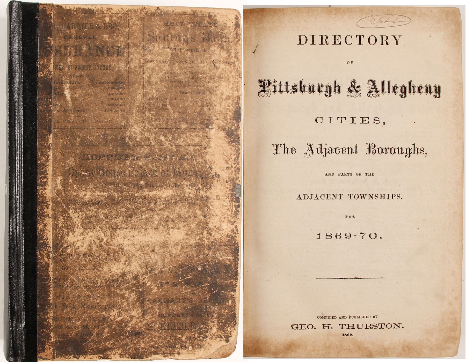 Directory of Pittsburgh and Allegheny Cities, the Adjacent Burroughs, and Parts of the Adjacent Townships for 1869-70, compiled and published by Geo. H. Thurston, 1869. 528 pages plus ads. Color printed page opposite the title page, reinforced binding. City: Pittsburgh and Allegheny State: Pennsylvania Date: 1869 HWAC# 82971
