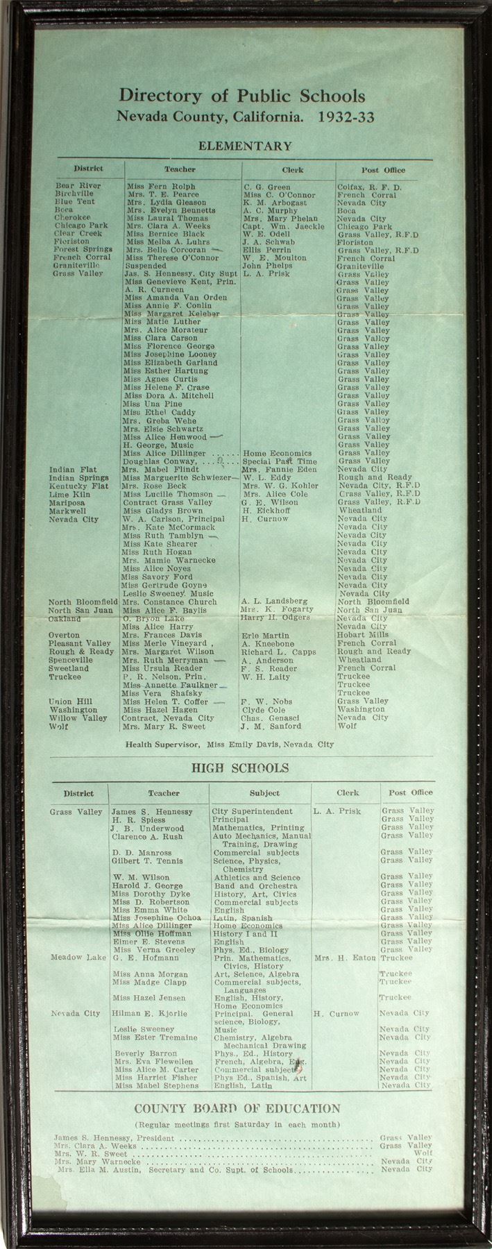 Three high schools: Grass Valley, Nevada City, and Meadow Lake. Lists teachers and subjects. Thirty-three elementary schools including cities of Wolf, Washington, Truckee, French Corral, Rough & Ready, Wheatland, North San Juan, Graniteville, Chicago Park, Colfax, Nevada City, Grass Valley, etc. Lists teacher - most are one room school houses. 7 x 177.5" framed. 0 State: California City: Nevada County HWAC#: 48808 Date: