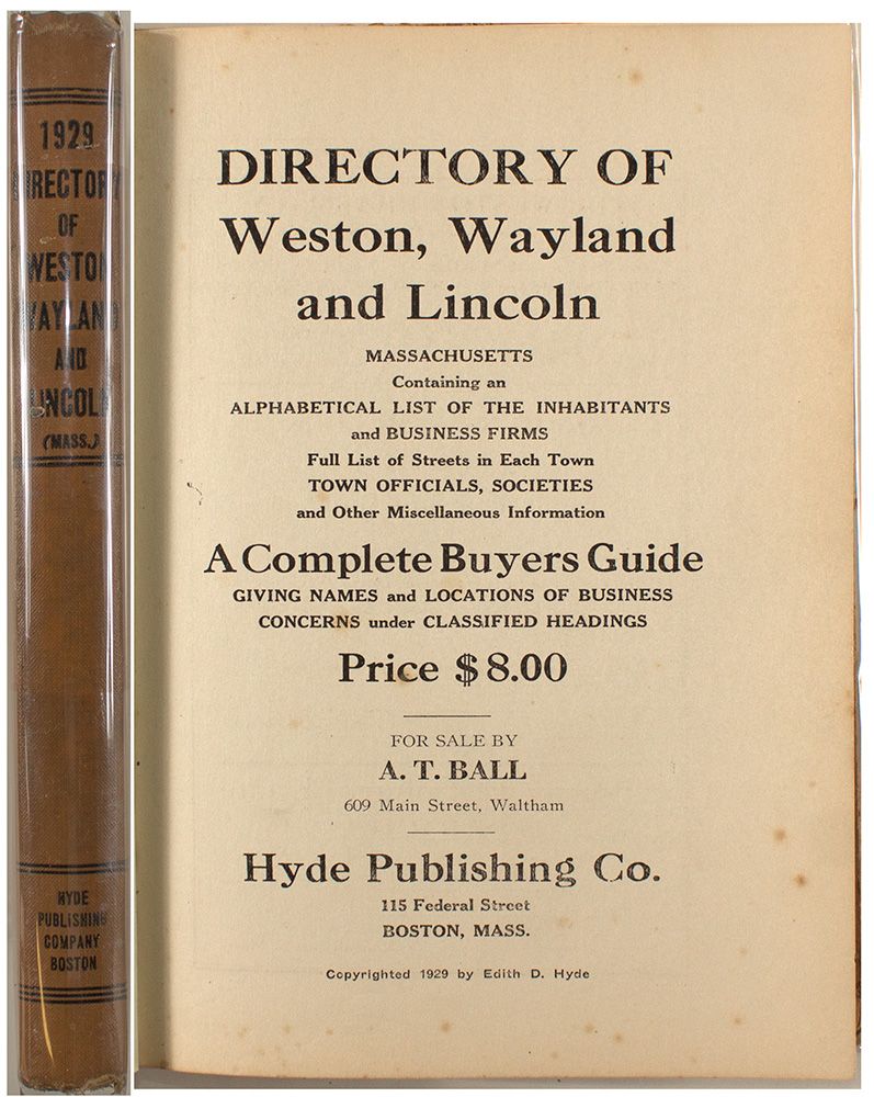 “containing a complete resident, street, and business directory, town officers, schools, societies, churches, post offices, library, etc. : census of Massachusetts.” Advertisements throughout with an index. Table of Contents for business directory, post offices, cemeteries, churches, libraries, schools, railroads, and FIRE ALARMS. Four inserted half pages: 80A, 80B, 80C, and 80D. Excellent condition. Very little foxing. Covers have some spotting. 212 pages. [Rarity: i]City: WestonCounty: State: MADate: