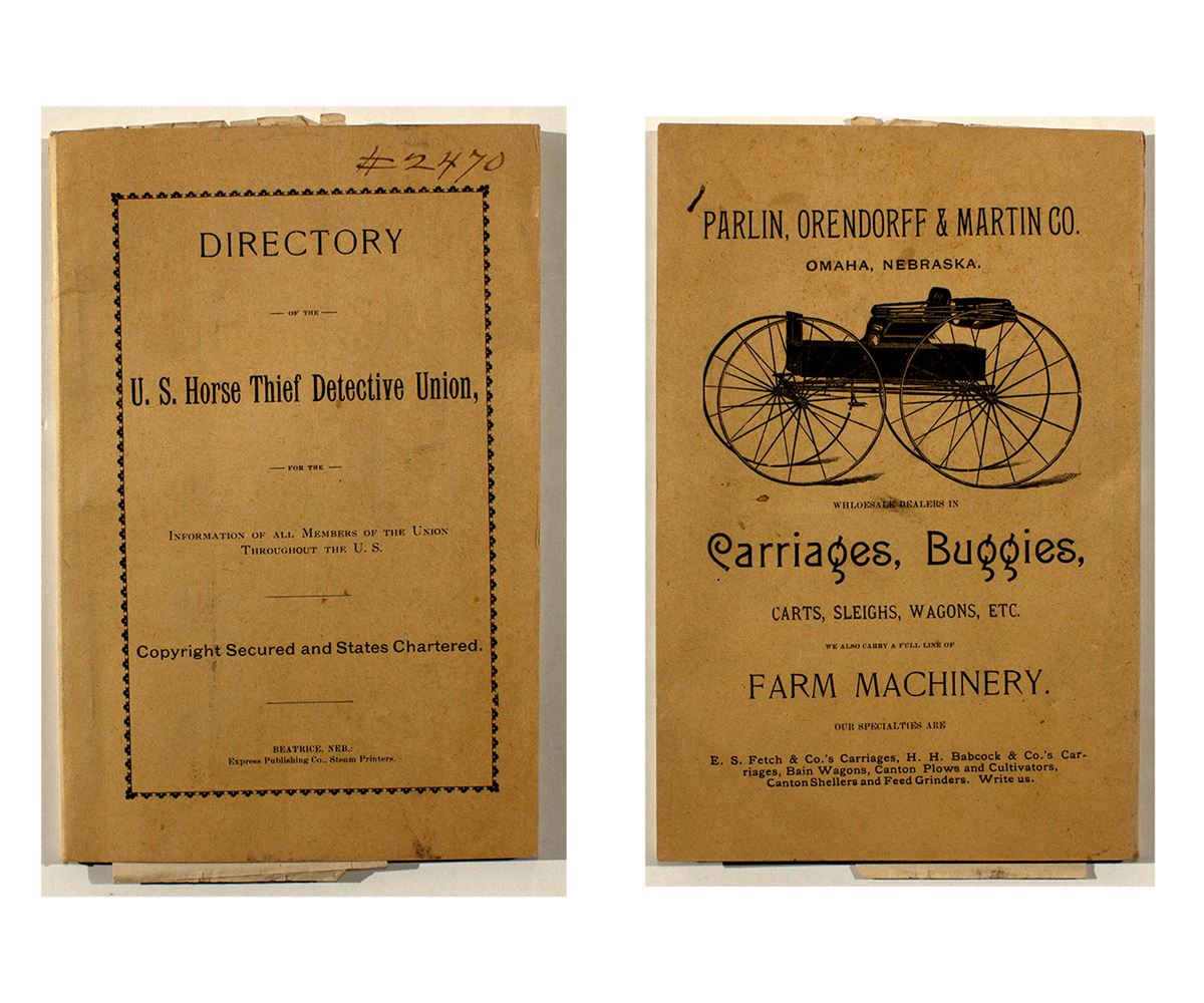 Information of all members of the union throughout the U. S. Copyright secured and states chartered--no date. Express Publishing Co., Steam printers, Beatrice, Nebraska. Folded inside front cover, a sheet that reads: "Directions: brand horse o inside right front foot, halfway between shoe and hairs. Brand buggy on right side front end under body. Brand harness inside right tug, four inches from hame. Brand saddle inside right stirrup, four inches from saddle. Etc...." Tan soft cover, ad on back cover for carriages, buggies. (8.5" x 5.5") 84 pp.