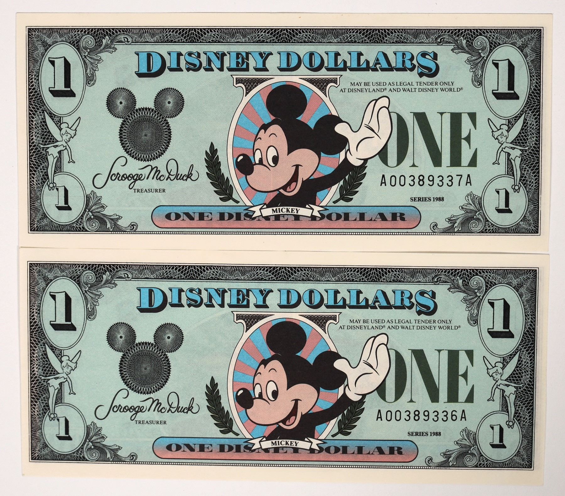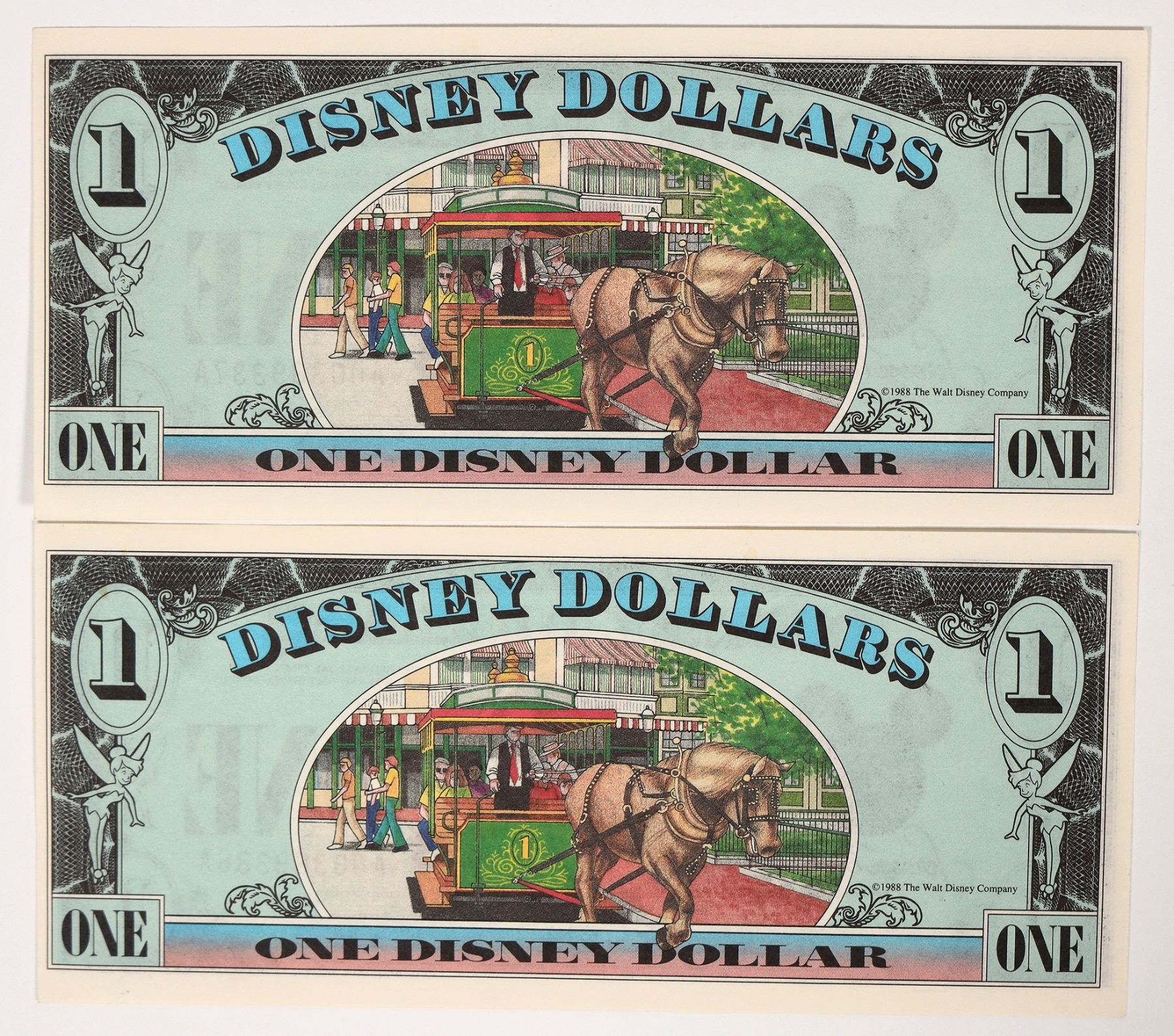 Mickey Mouse is the vignette, Tinkerbell graces each side, and Scrooge Mc Duck is the treasurer on these two colorful Disney Dollars from 1988. "May be used as legal tender only at Disneyland and Walt Disney World." The horse drawn street car from Main Street is on the reverse. Each piece 6 x 2 1/2 inches. Crisp uncirculated. A specimen graded EPQ 69 is listed on EBAY for $25,000. The currency was discontinued in 2016, but Disney still accepts the bills at their theme parks, cruise ships and the Disney Store.