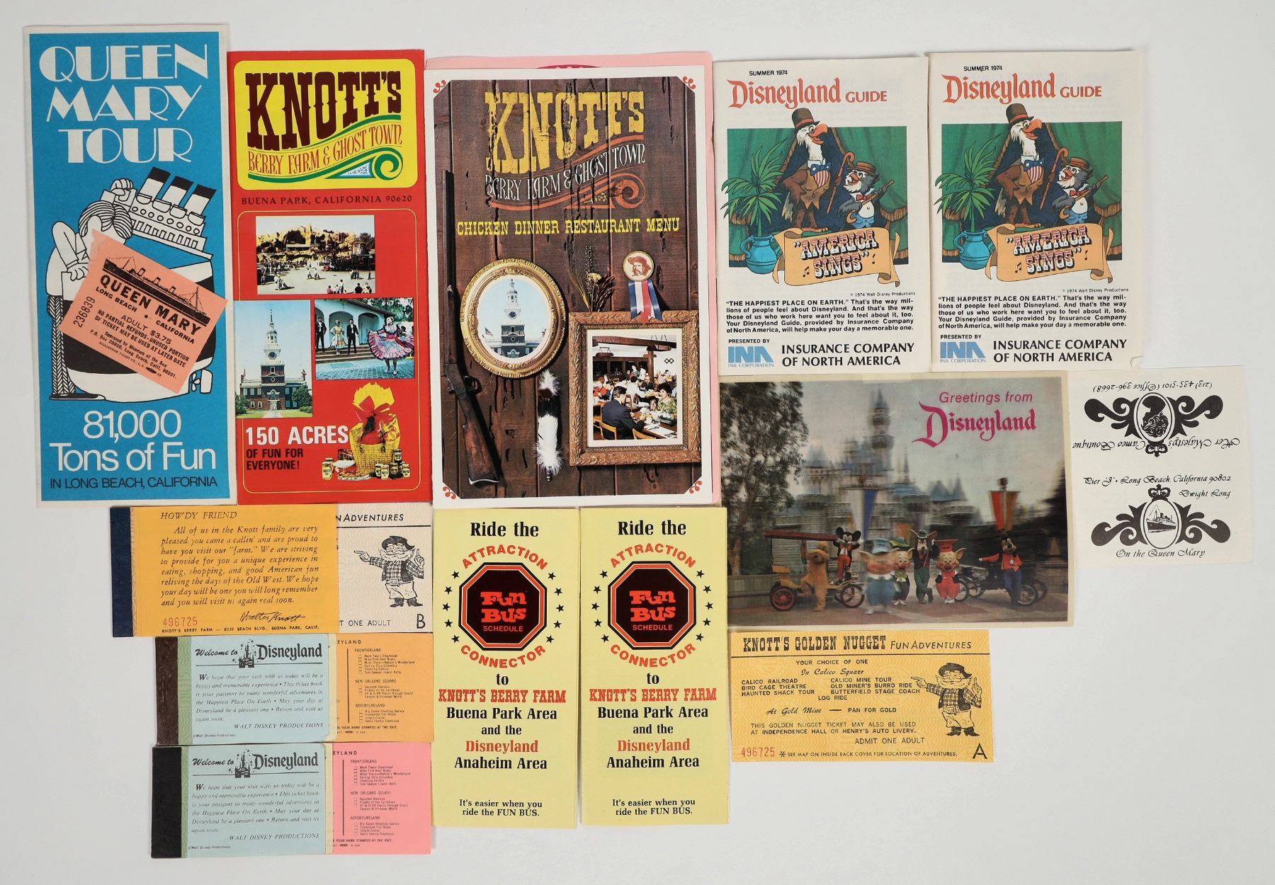 Eclectic group of photos, guide booklets, ticket books, park maps, and even a Queen Mary Tour pamphlet. Includes a Knott's Berry Farm "Chicken Dinner" restaurant menu, with a Boysenberry pie slice at .50 cents. All pieces in excellent near-mint condition. Peruse the photos!