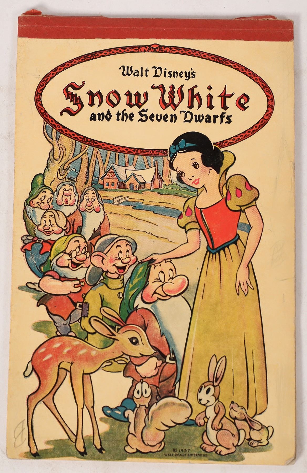 1937 Disney Snow White pad, 8x5". Verso missing, many pages have writing, some pencil writing on illustration cover. Please inspect.