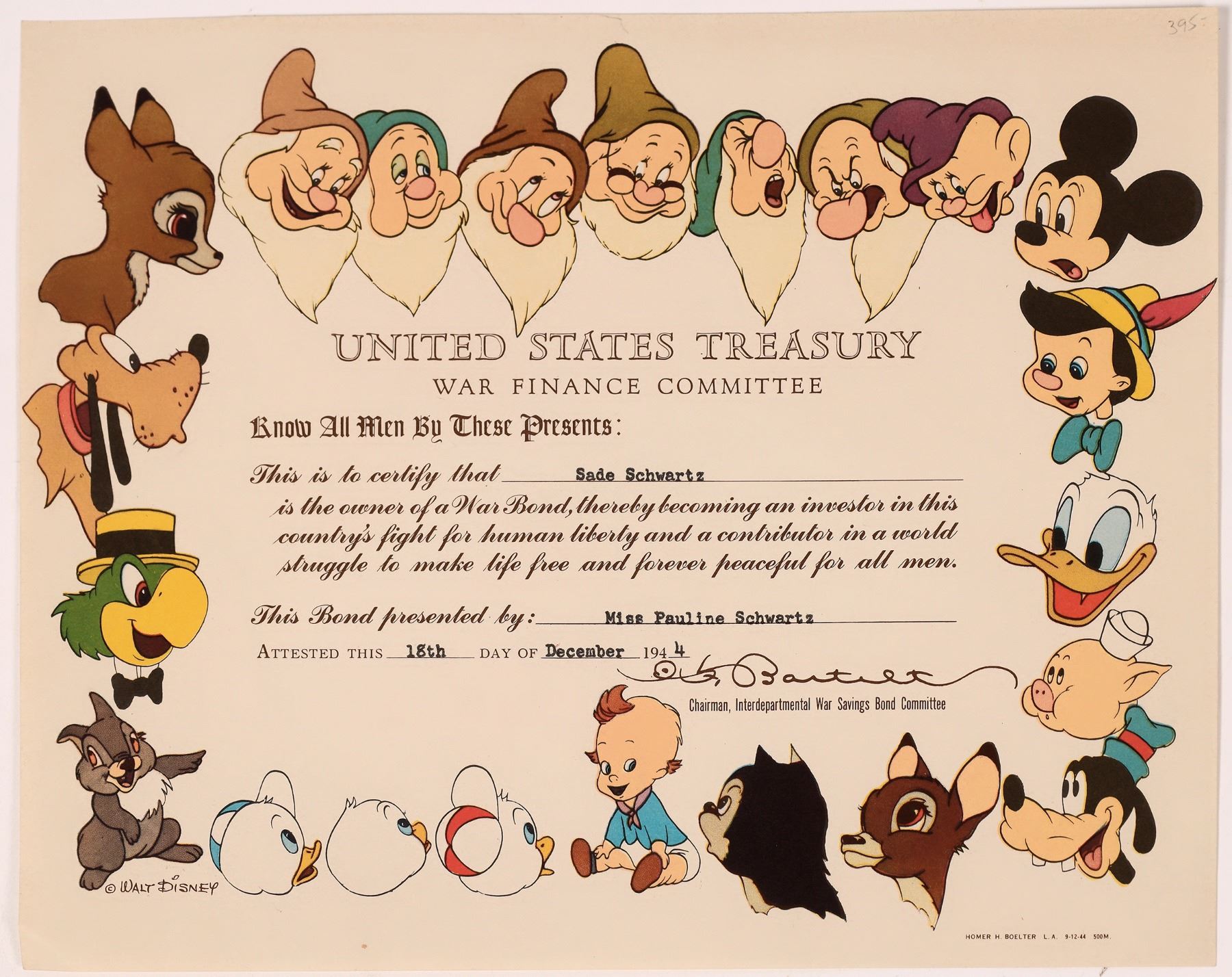 Beautiful color certificate with Walt Disney character illustrations as the border. Issued by the United States Treasury, War Finance Committee, to certify that Sade Schwartz is the owner of a war bond, "thereby becoming an investor in this country's fight got human liberty and contributor in a world struggle to make life free and forever peaceful for all men." Printed by Homer H. Boelter. 8 x 10" Very good condition.