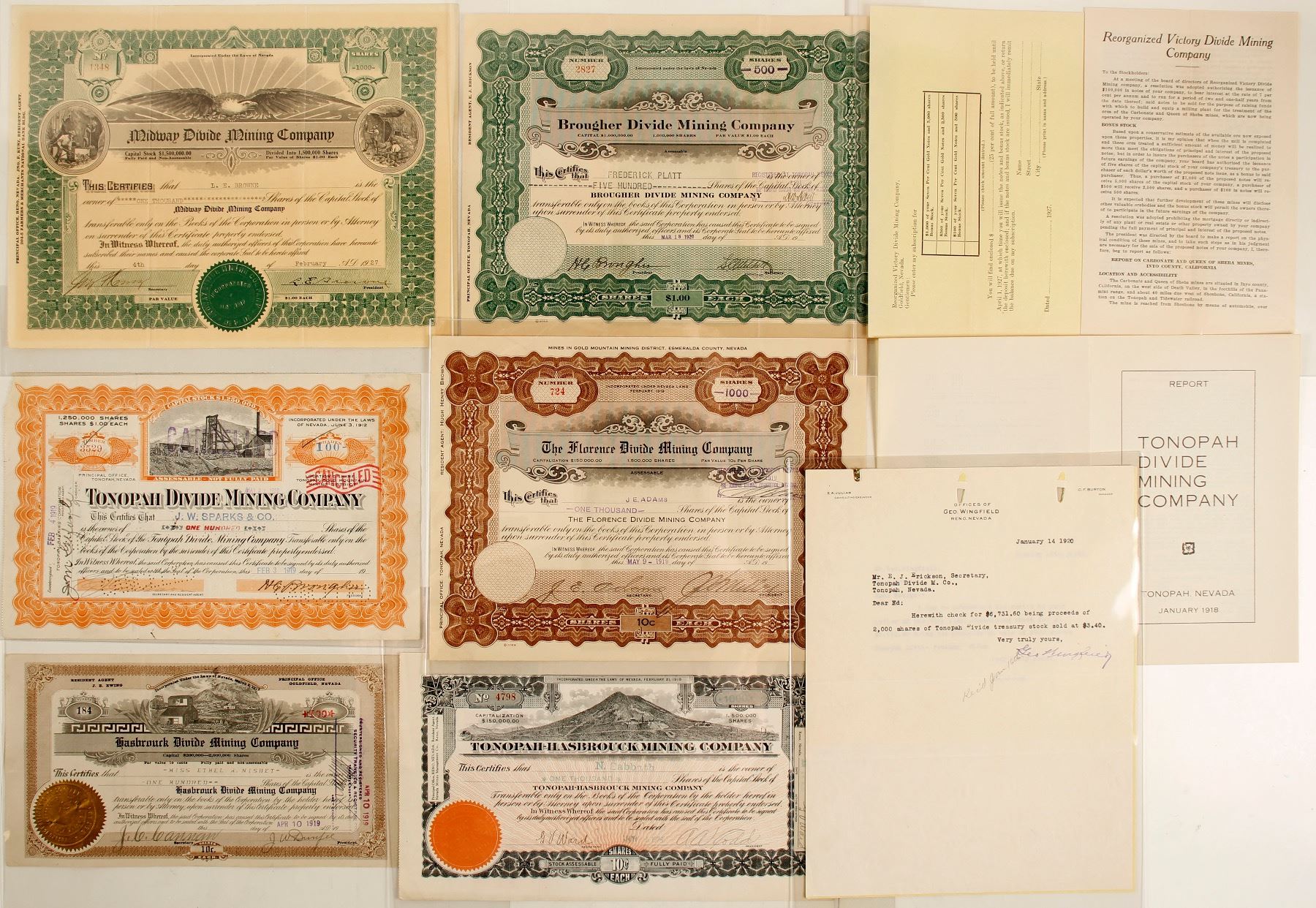 Gold Mountain Mining District, Esmeralda County. Lot of 10. 1) 1920 letter from the office of George Wingfield in Reno to secretary Erickson of the Tonopah Divide Mining Co. Re: check for sale of stocks. Signed by Wingfield. 2) 1918 report for the Tonopah Divide Mining Company. 2pp. 2) Stock order form and 3pp. message to stockholders of the Reorganized Victory Divide Mining Company, 1927. 3) Six different issued stock certificates. Included: Midway Divide Mining Co. (1927, not cxl, eagle and mining vignettes); Brougher Divide MC (1920, not cxl.); The Florence Divide MC (1919, not cxl); Hasbrouck Divide MC (1919, not cxl., mining vignette); Tonopah-Hasbrouck MC (1925, not cxl, nice vignette of mines on mountain); and Tonopah Divide MC (1919, punch cxl, vignette of mine works). Please inspect. (Bennett Collection) Date: 1918-1927 City: Tonopah State: Nevada HWAC# 68065