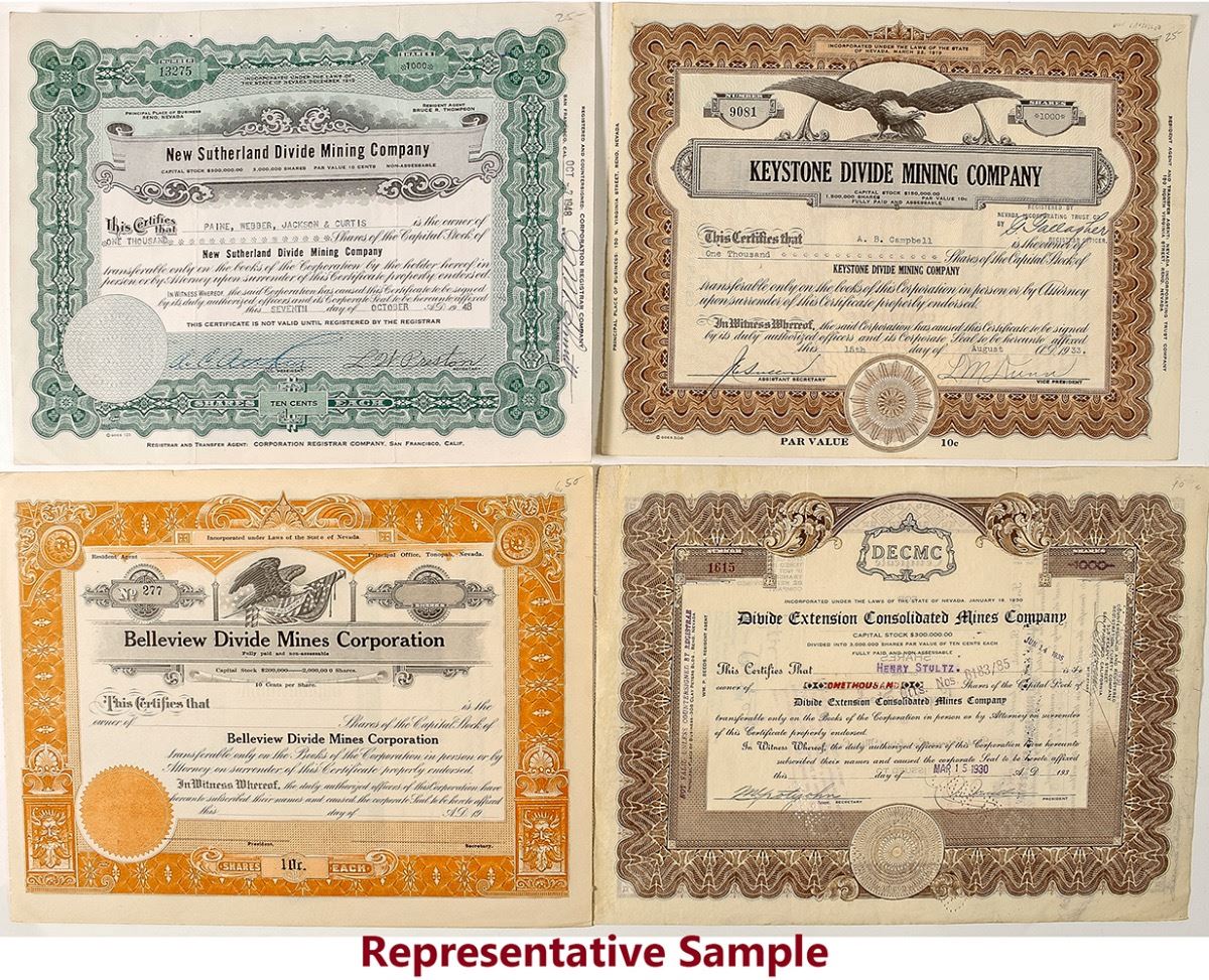 Huge lot of 61 Nevada mining stocks, most with the word "Divide" in their titles. Others included. Dealers take note: 61 pieces divide and prosper!! City: State: Nevada Date: ID# 44203