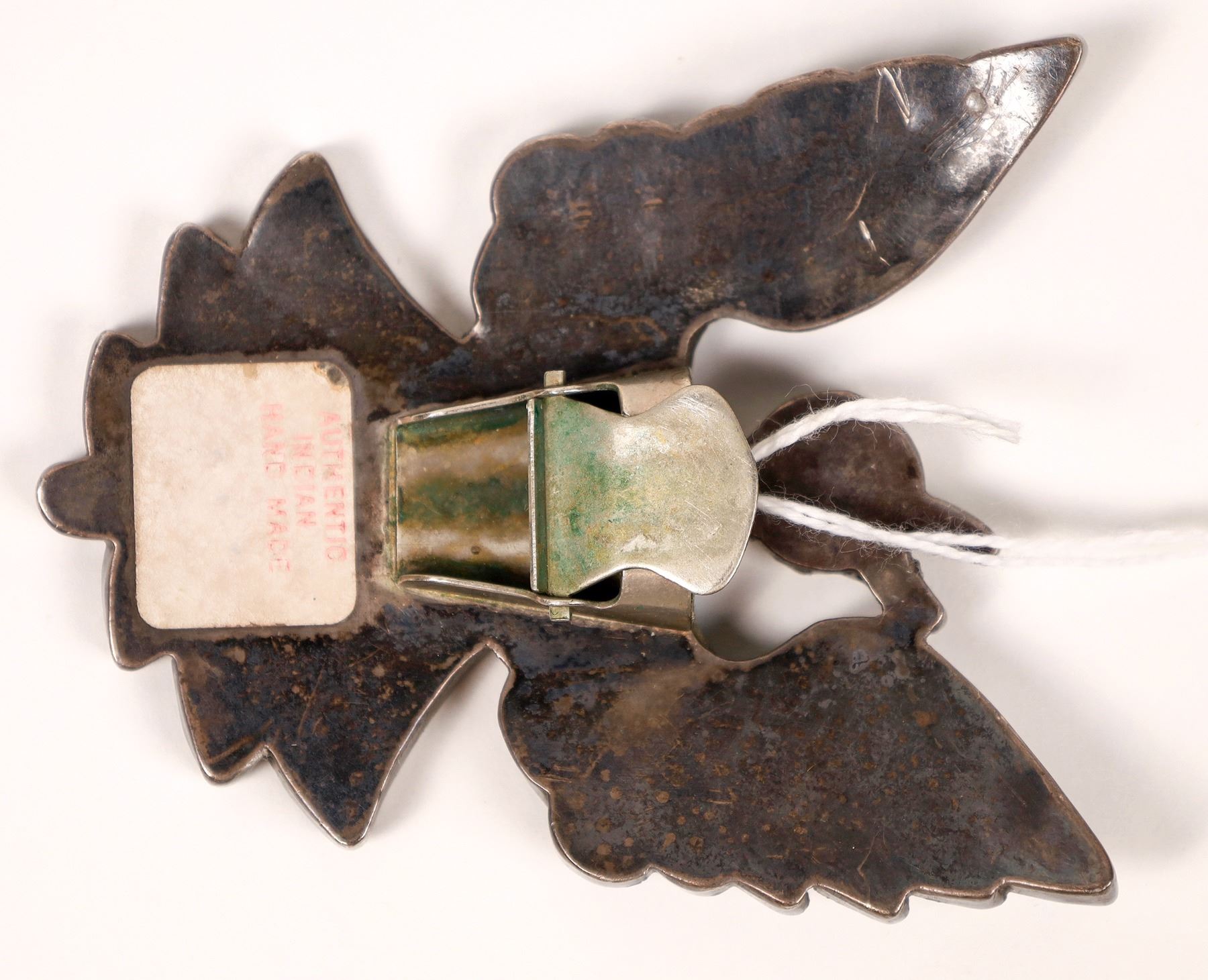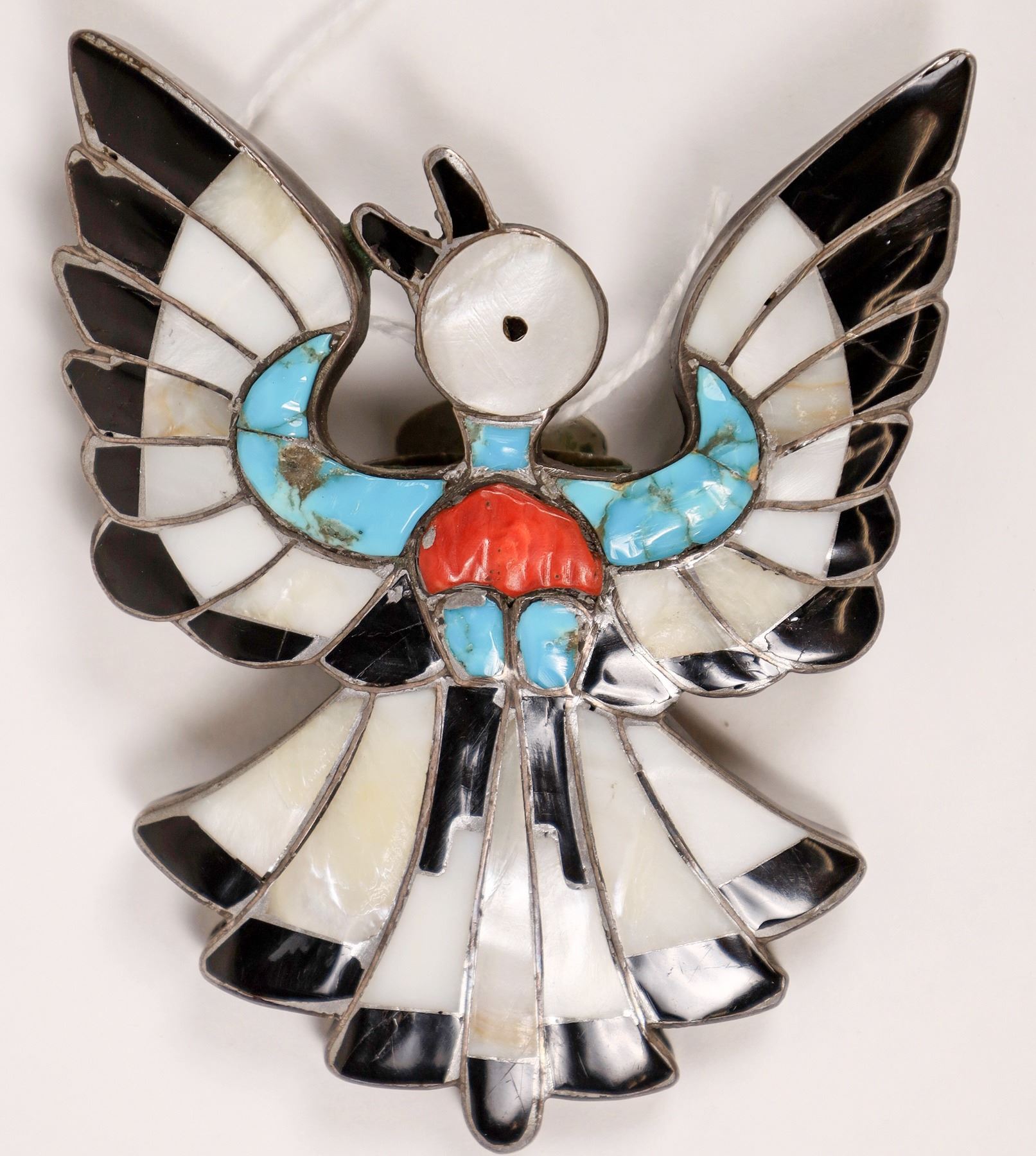 Dixon Shebola (Zuni, 1937-1976). Peyote bird, inlaid with turquoise, onyx, mother-of-pearl, and coral. 3" x 2.25". This is an excellent example of Shebola's fine work. Piece is unsigned.