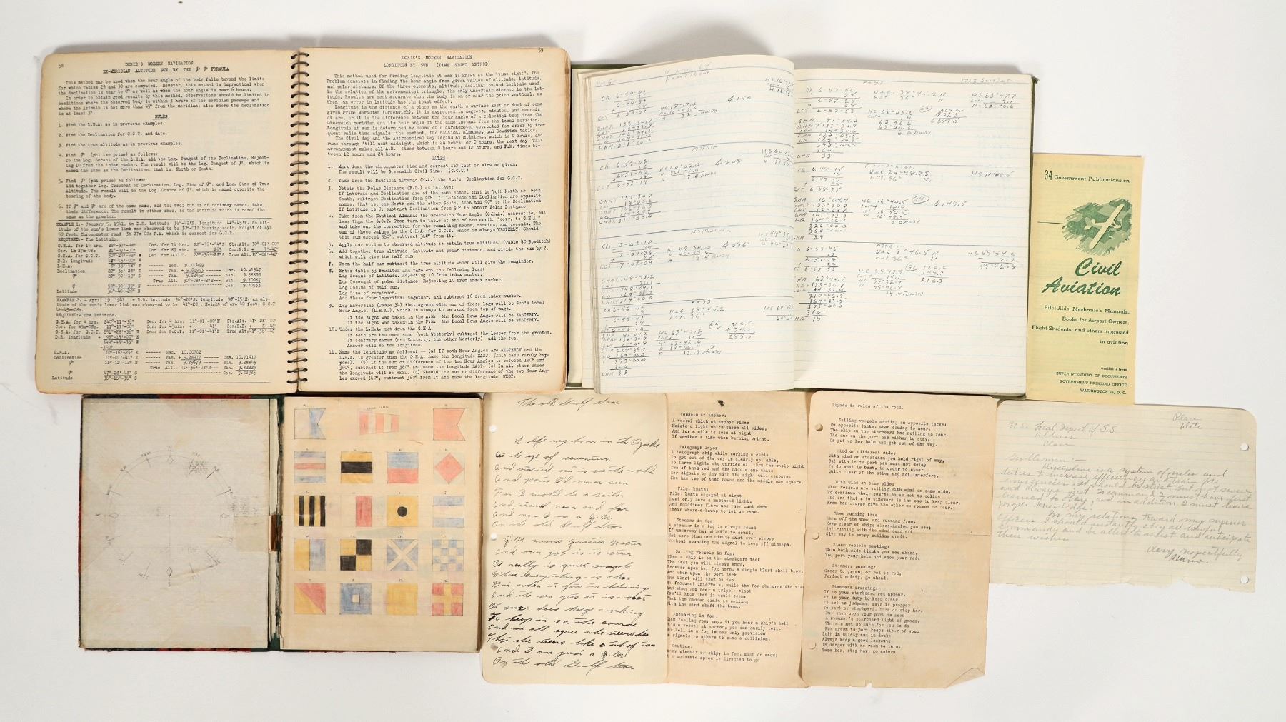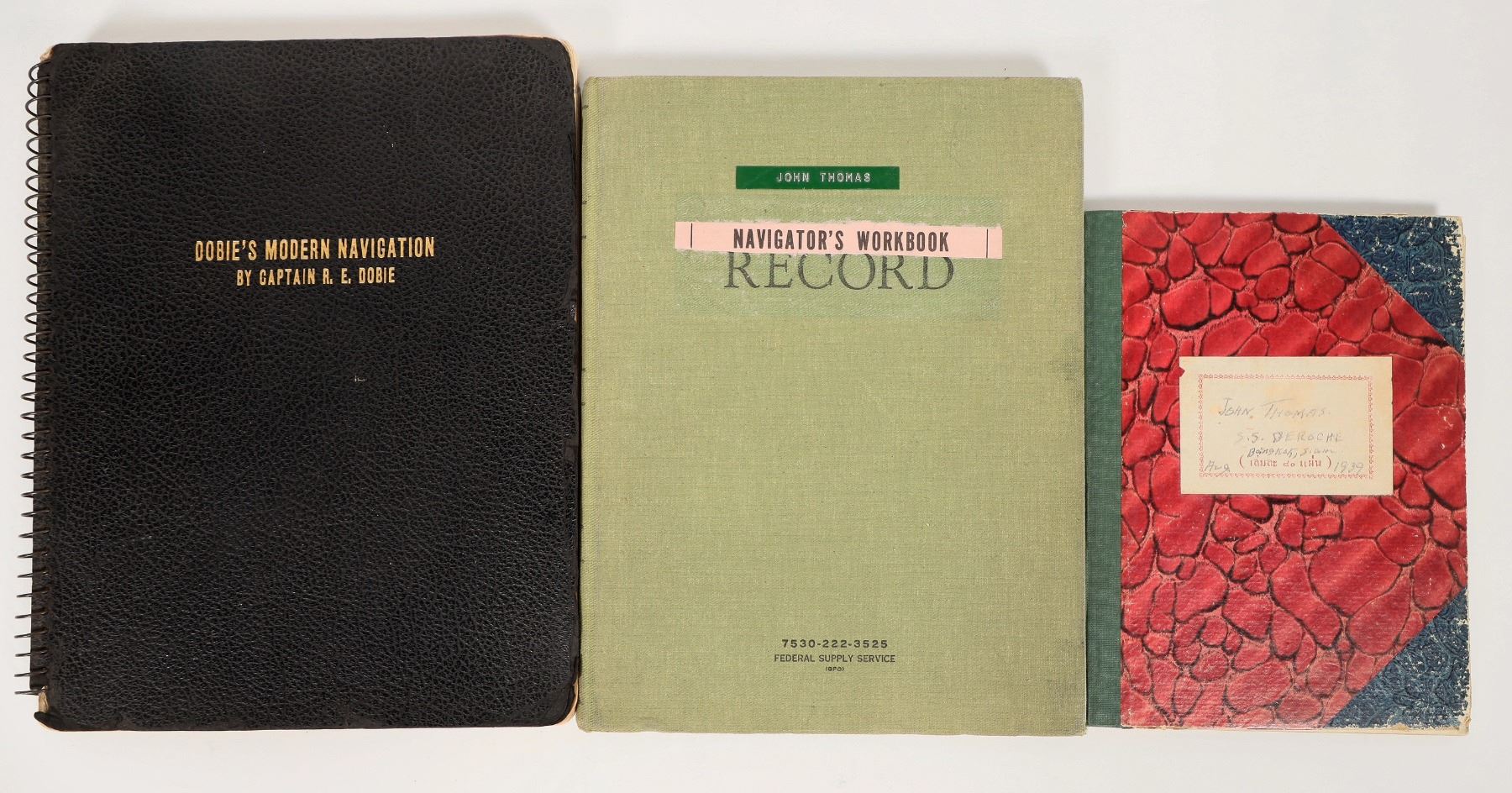 This lot holds three books belonging to navigator John Thomas employed by the Union Oil Company. Dobie's Modern Navigation is a spiral bound book on coastal and celestial navigation dated 1941. Get your pencils out 'cause you're calculating your location using a sextant and the stars. One log book tracks the SS. DeRoack from Bangkok, Thailand (Siam renamed in 1939) to San Francisco, Ca. in 1939. You can actually track their progress by his daily logs. The book also contains his personal drawings of code flags and the morse code. The rules of the road are remembered in sailor's poems makes a great read when you have nothing but sea in front of you. (They are loosely bound.) A second log book is dated 1964 aboard the M.S.T.S. (Military Sea Transportation Services) SS. Michelson using the stars for navigation now as a US Navy Seaman. If you love the sea this is a must read.