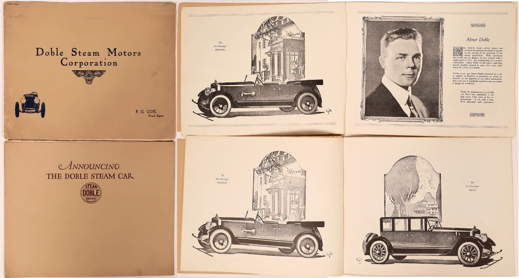Lot of 2. Booklets published by the Doble Steam Motor Co, San Francisco. 1923. Cardboard covers, stapled binding. Announcing the Doble Steam Car, 8pp w/pictures of the cars. The other booklet, 12 pp, is a company history w/pictures of the Doble cars along with driving assembly/chassis images. By F.G. Cox, Fiscal Agent. Page sizes 8 1/2" x 1o 10 1/2". Both booklets in excellent condition. State:California City:San Francisco Date:1923 Provenance: