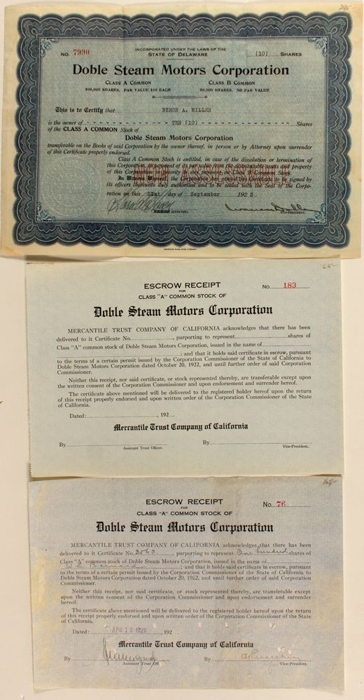 Two escrow receipts and one stock cert. Famous steam automobile. Prag Collection