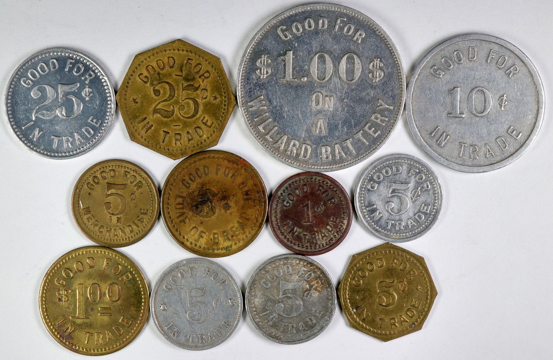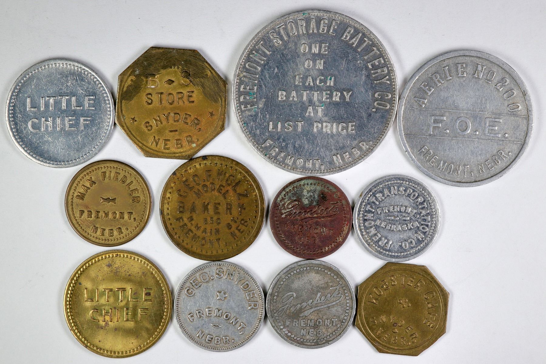 Lot of eleven: Snyder (2): B. S. Store; Koester Cafe. Fremont (9): Geo. Synder; Geo. F. Wolz; F. O. E. Aerie No. 200; Little Chief (2); Fremont Transportation Co.; Max Fiedler; Fremont Storage Battery Co.; Grumperts (1c & 5c).