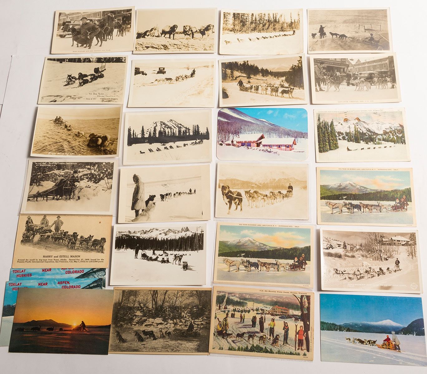 Lot of 26. 12 black and white RPC's. Includes Evans Native Dog Sled, Frasher June Lake photo, Ed Clark's New Jersey team, team on Grouse Mountain near Vancouver taken in 1927, a Taylor photo, team in front of 1920's automobile, etc. Dog teams on Mount rainier, Aspen, Massachusetts, Rib Mountain in Wisconsin, Lake Placid, White Mountain. Interesting black and white postcard of Harry and Estell Mason on their way from Nome, Alaska to the PPIE in San Francisco. One card has a note on back that the lead dog was 11 years old and died two months ago. Two 1936 Lancaster (NH) black and whites. One shows the winner Ross Standard. His time was 1 hour, 21 minutes and 27 seconds for 17 miles. The other shows the fourth place team of Mrs. Taylor. Date: Location: HWAC# 54011