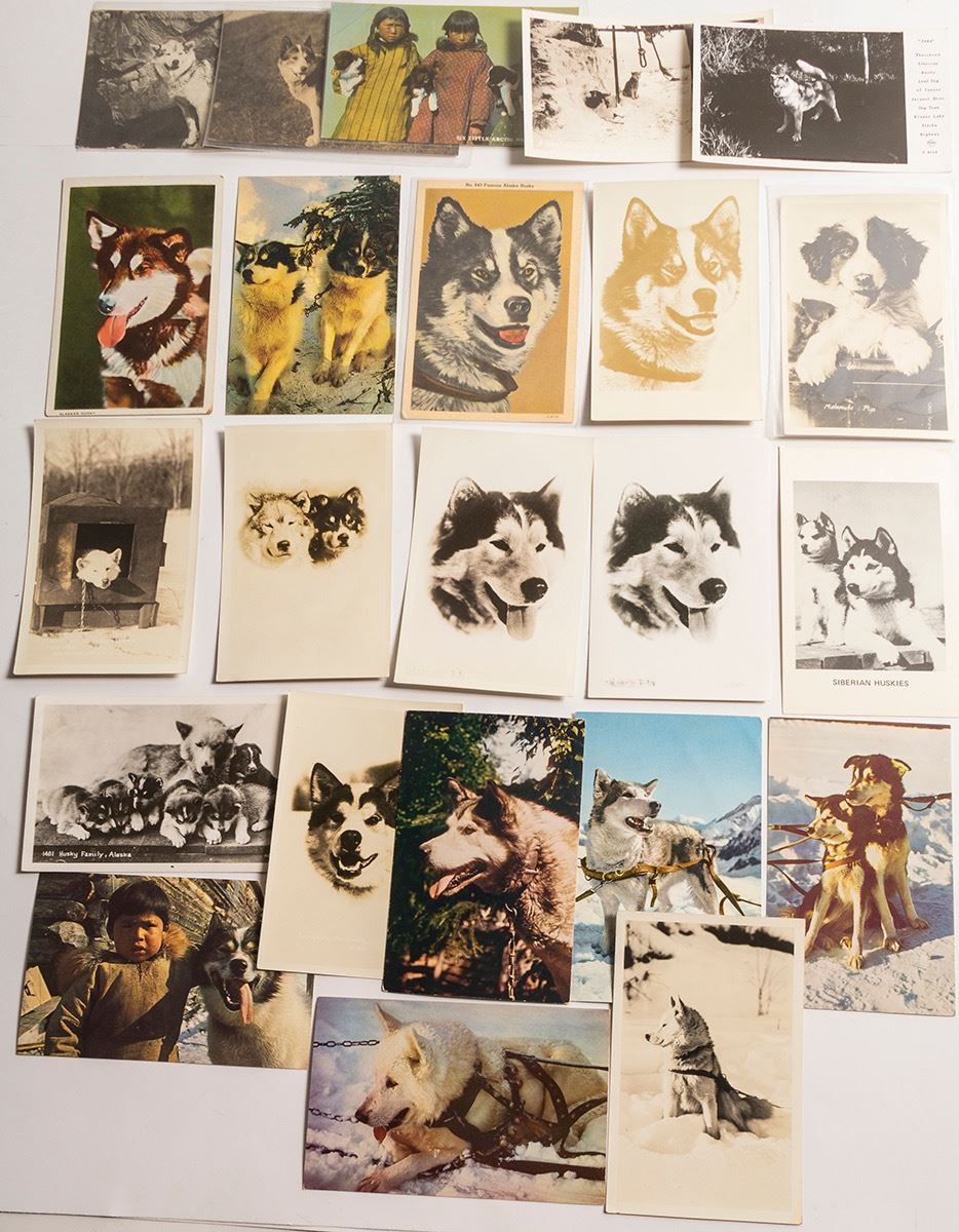 Lot of 23. 13 black and white RPC's, 5 color RPC's. Three show puppies. Photos by C. P. Johnstone, Conn, Joe Huber, Fraser. Most not identified. Our favorite is a dog in the grass (not snow) by Lomen Brothers. It is postmarked Iditarod, Alaska, 1911. Date: Location: HWAC# 54009
