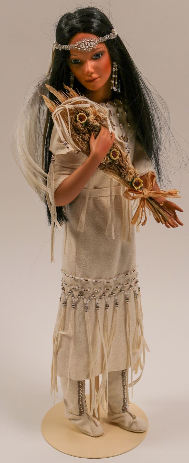 This doll is called "Morning Bird Song" wears a beautiful white "suede" dress with elabore beadwork and fringing, and high beaded moccasins. 19" tall. The artist is Sandra Bilotto. Comes with Certificate of Authenticity number A12099. This is issued by the Ashton-Drake Galleries.
