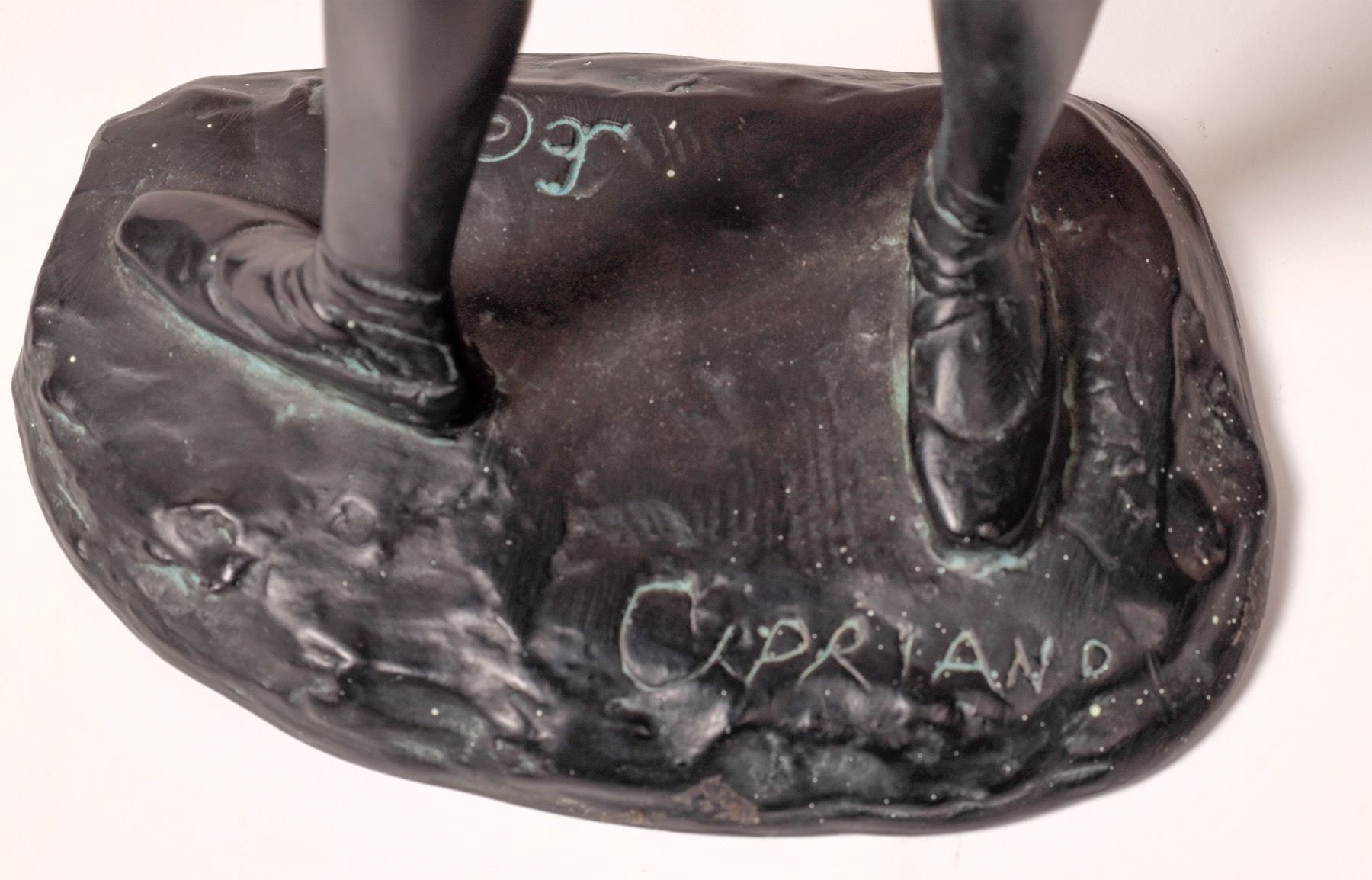 Doll with black and white outfit, 19". Doll with green hair ribbons by Wayne M Kleskie, 23". Resin ballerina sculpture by Cipriano, 14".