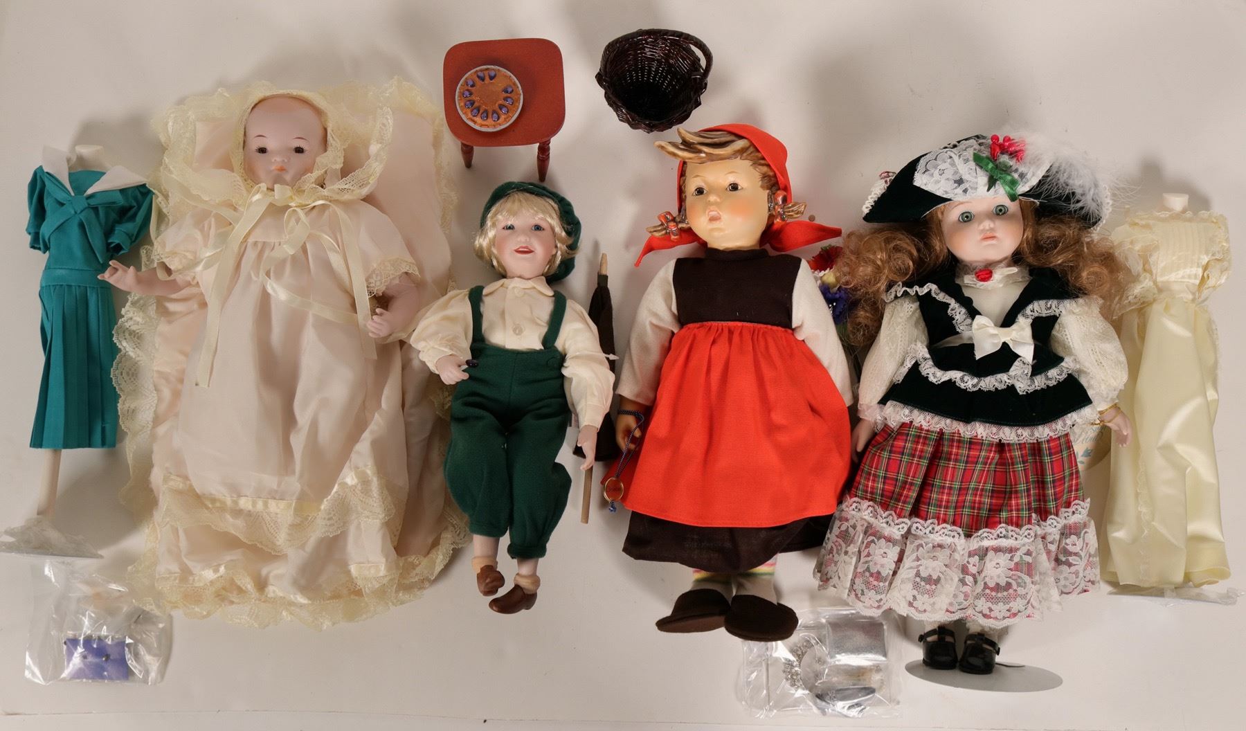 This is a collection of five dolls. There is the Hummel "On Holiday" girl made in Germany NIB. Design Debut's "Shannon Michele " porcelain doll 18 in. tall NIB. A Heritage doll 13 in. tall wind up musical doll that plays "Over the Rainbow" with pink night dress and matching comforter NIB. Two Princess Diana dolls from the Danbury Mint Royal Wardrobe Collection, one is a Teal Blue Sailor Dress and the second is a Cream-White Satin and Lace Ballgown NIB. A "Little Kack Horner" doll by Edwin Knowles China Company NIB.