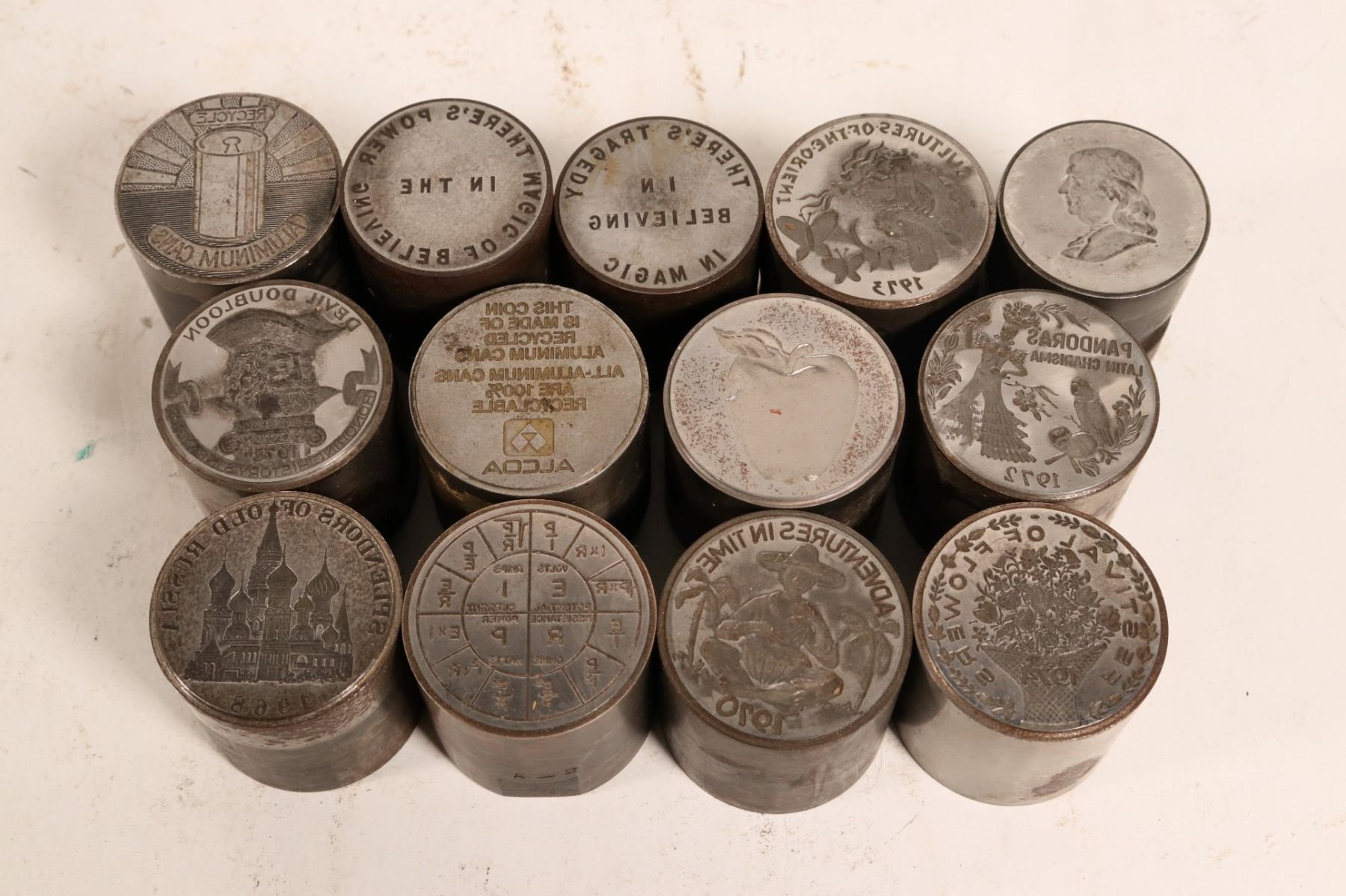 one dozen dies from: Pirtate, Ben Franklin, MAgib, Floral, Russia, foreign, recycle. All dollar size. From the Northwest Territorial Mint Historical Die Collection.