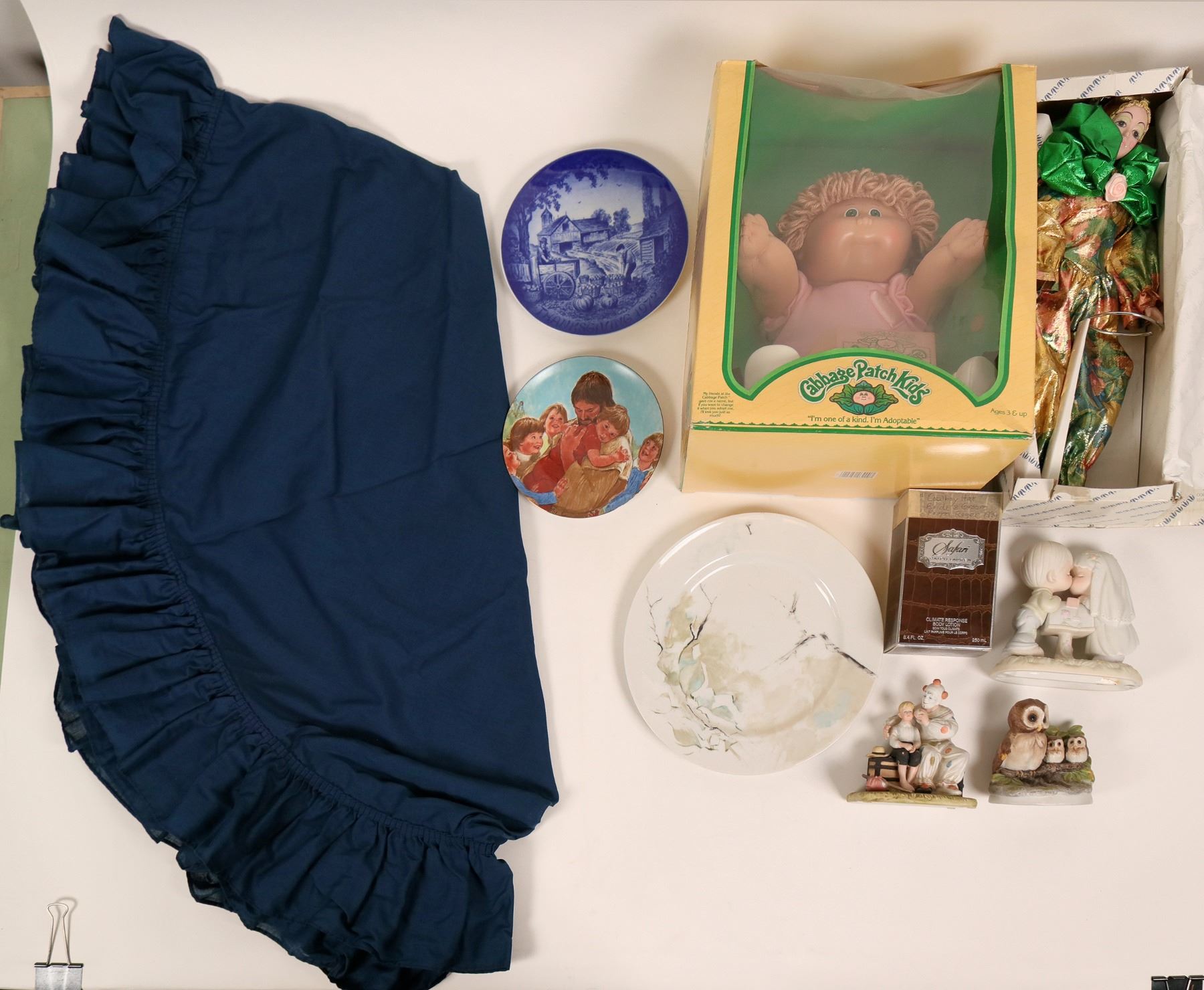 An eclectic selection of dolls and holiday plates. There's a Cabbage Patch Doll as well as a harlequin, a Norman Rockwell ceramic figure, two plates and more. See photos for more details.