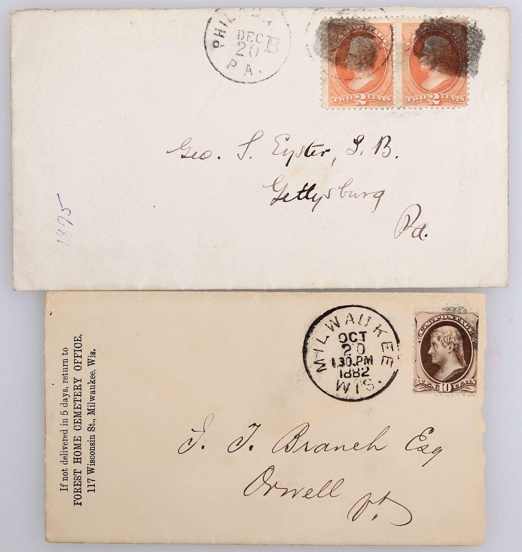 2 domestic covers. 1882 A45 Milwaukee to Orwell NJ. 1875 written in ink Orange 2 cent pair, Philadelphia to Gettysburg, PA.