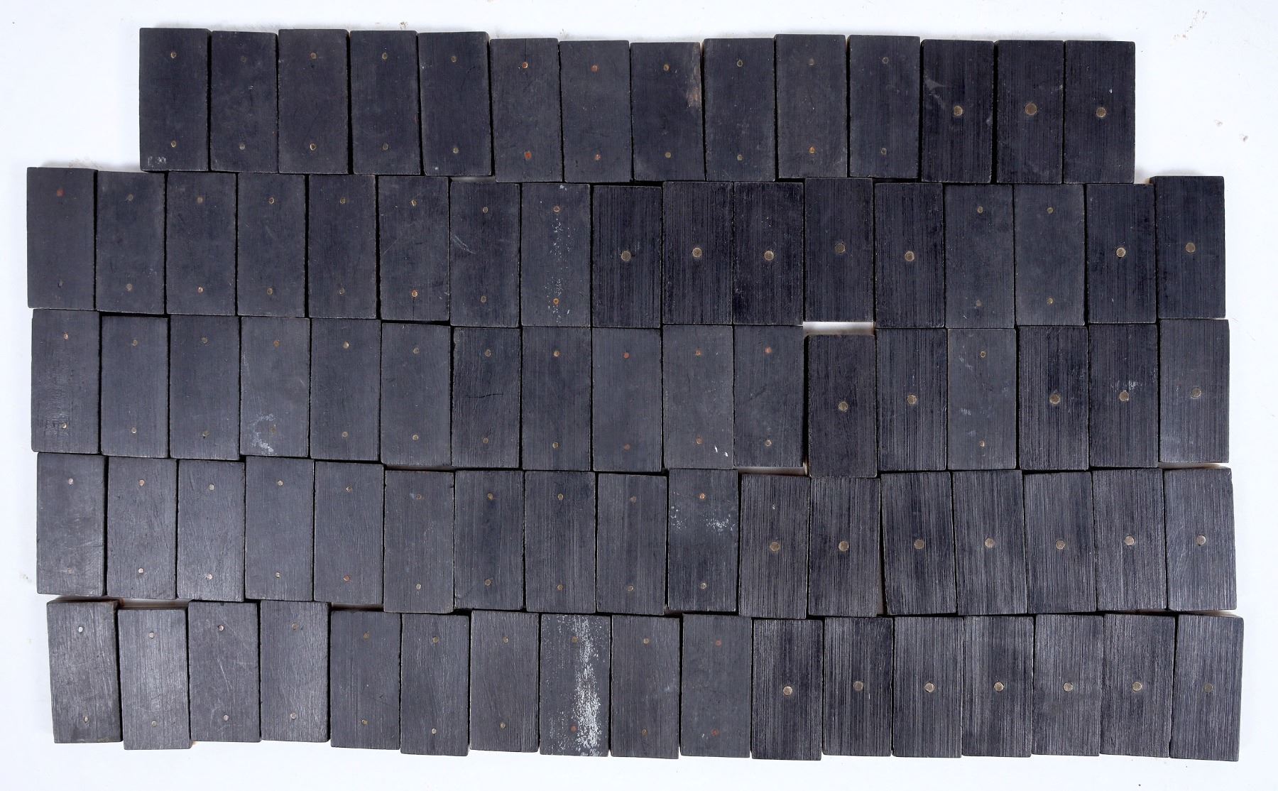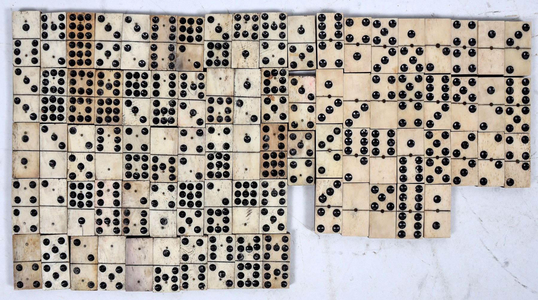 Lot 1: (2) Sets of Antique Bone and Ebony Dominoes. 29 in one set. 3 in one set. Smaller set has larger dots. 1 has one brass piece holding 2 pieces. Most found on the S.S. Central America