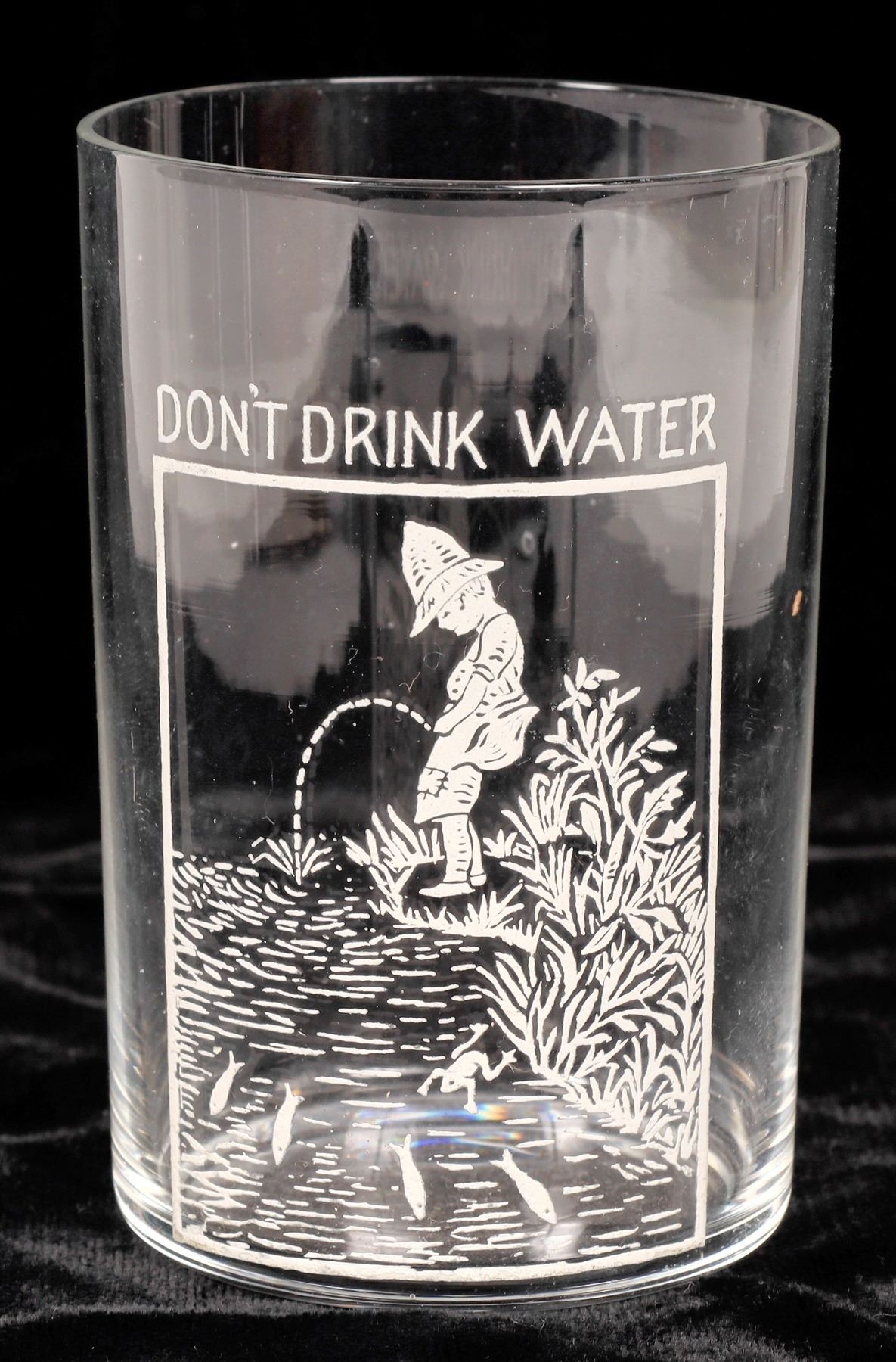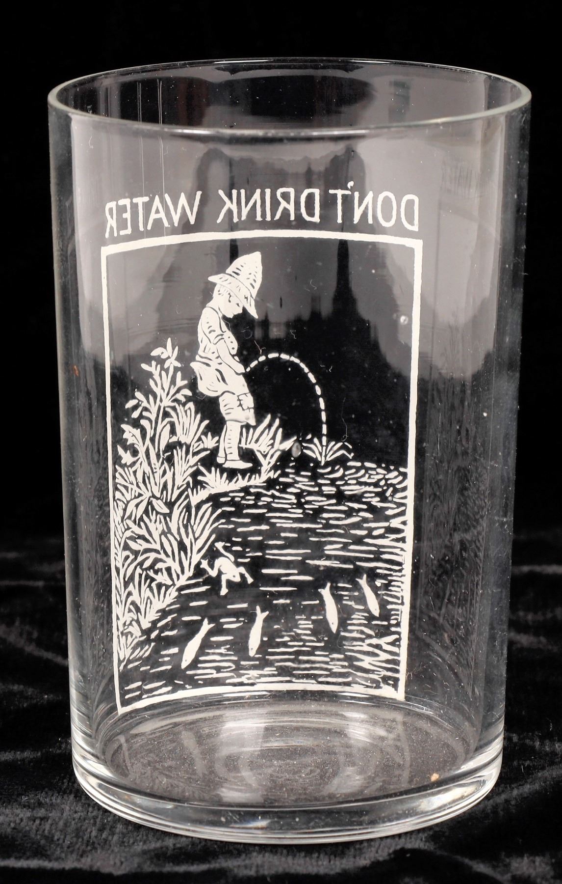 A fantastic humorous beer glass. This vignette was used a lot in whiskey advertising c. 1900-10. The male is fouling the water as one can see. Don't Drink Water. 3.5".
