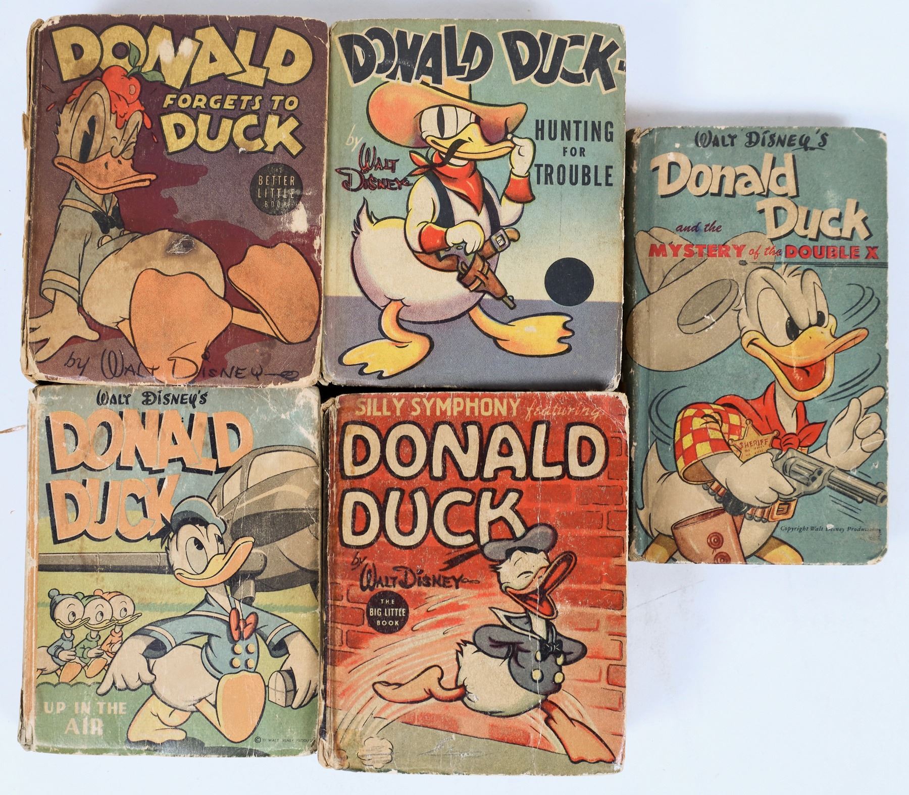 5 little Donald Duck books. Mystery of the Double X, Hunting for Trouble, Silly Symphony, Up in the Air, Donald Forgets to Duck. Fair to good condition.