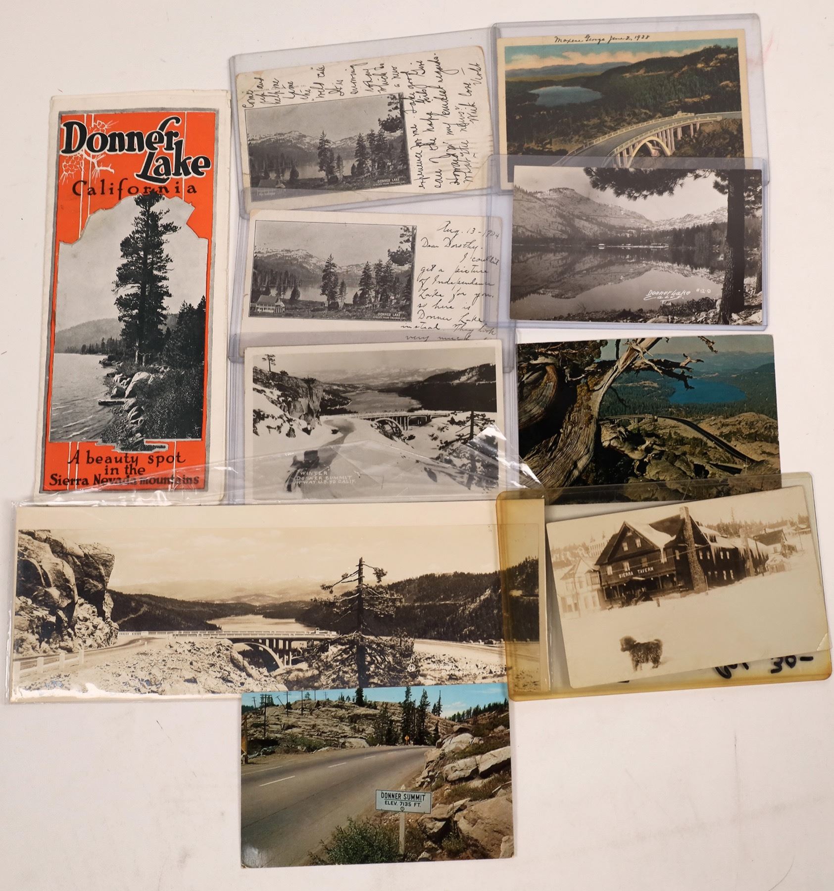 Collection of Donner Lake ephemera including eight postcards, a brochure, and a photograph. Postcards include real photo, linen style, and modern chrome postcards. Most of these postcards have correspondence written on them. Postcards are 5.5 x 3.5, good condition. The brochure advertises campgrounds and outdoor activities to do at the lake. Brochure is fragile, torn at the creases, 9.25 x 4.The photograph is a long panoramic view of the lake and mountains. 10.75 x 3.5, good condition. City: State:California Date: 1900-50