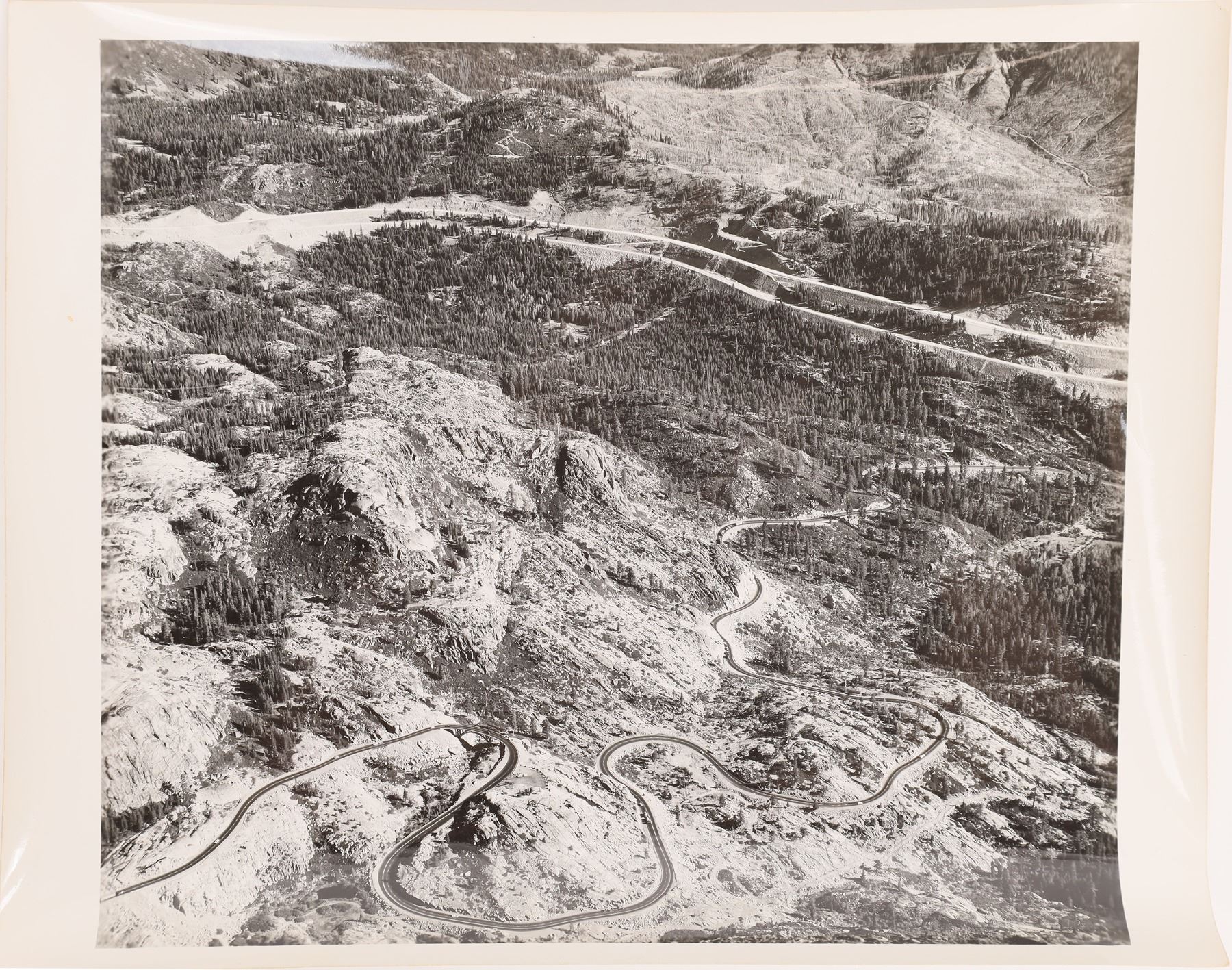 Bar graph by State of California showing Donner Summit snowfall from 1878-1963. Highest totals are close to 800 inches and this winter was also that extreme. 10.75x22.5". Center crease and rolled up. About 15 mostly 8x10" b/w photos of Route 80 area thru Northern California including Donner Summit. California Donner Summit