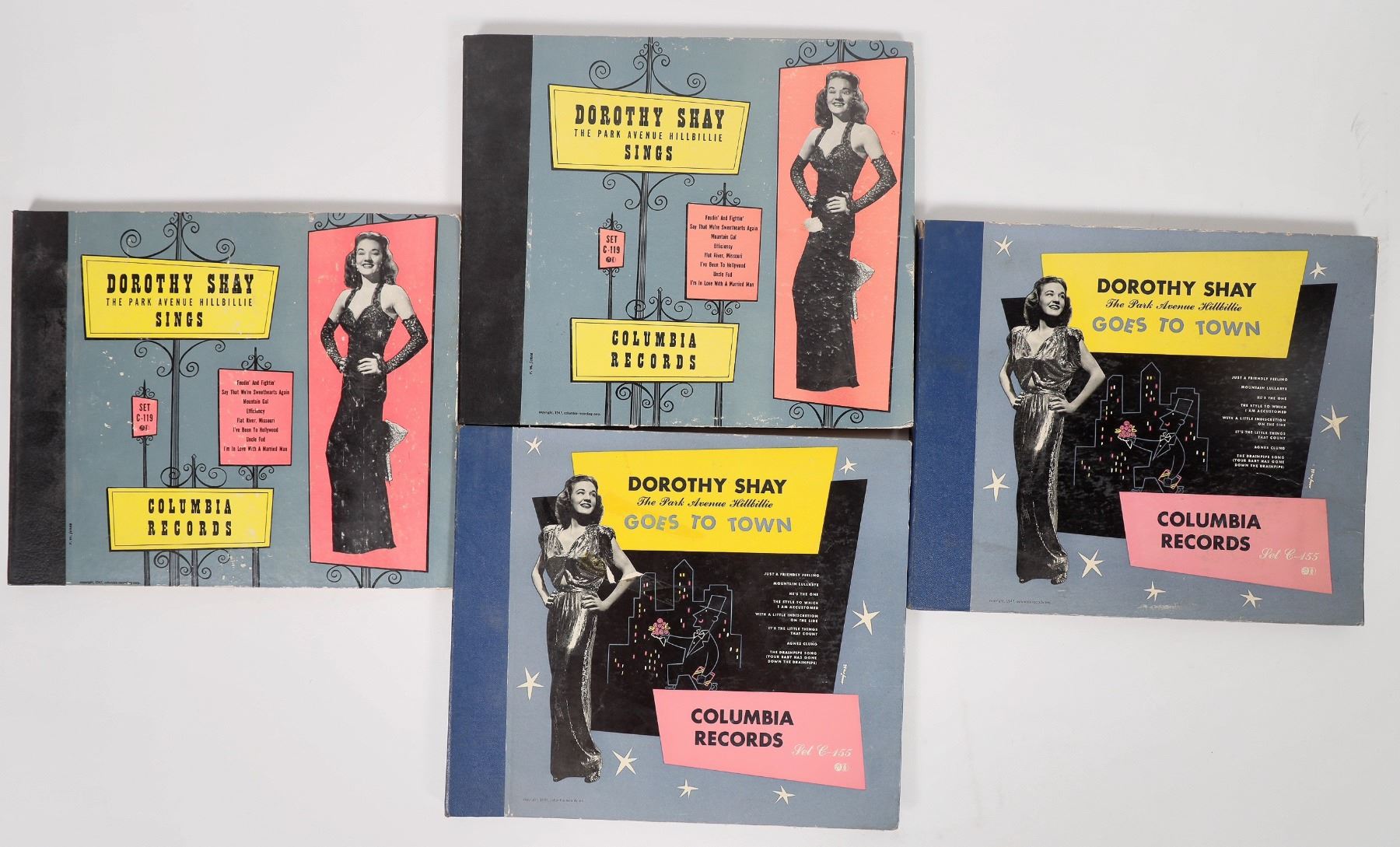 A group of 4 albums by American singer and actress Dorothy Shay, who went by the moniker 'The Park Avenue Hillbilly. In 1947, Shay became the first woman to have a #1 album on the Billboard chart. Lot contains two copies of 'The Park Avenue Hillbillie Sings (1946) and two copies of 'The Park Avenue Hillbillie Goes To Town' (1947). No records are missing from any of the albums.
